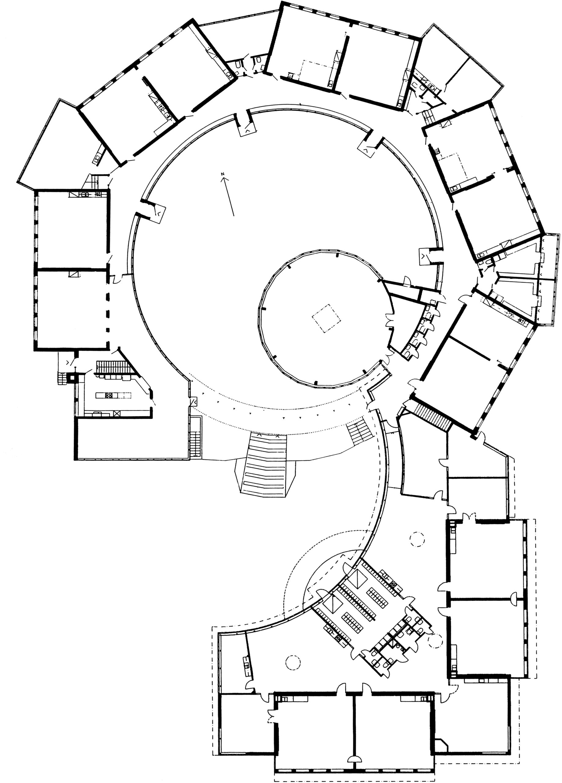 Grundstrukturen bygger på fem rektangulära volymer, med två klassrum i varje del, som är placerade kring en uppglasad korridor som omgärdar den runda skolgården. De fyra entréerna nås via den öppna skolgården vilket gör det möjligt att se vilka som kommer och går i skolan. De triangelformade utrymmena mellan de rektangulära volymerna nyttjas för toaletter och administrativa funktioner samtidigt som det skapar platser i korridoren där eleverna kan samlas innan och efter lektionerna.