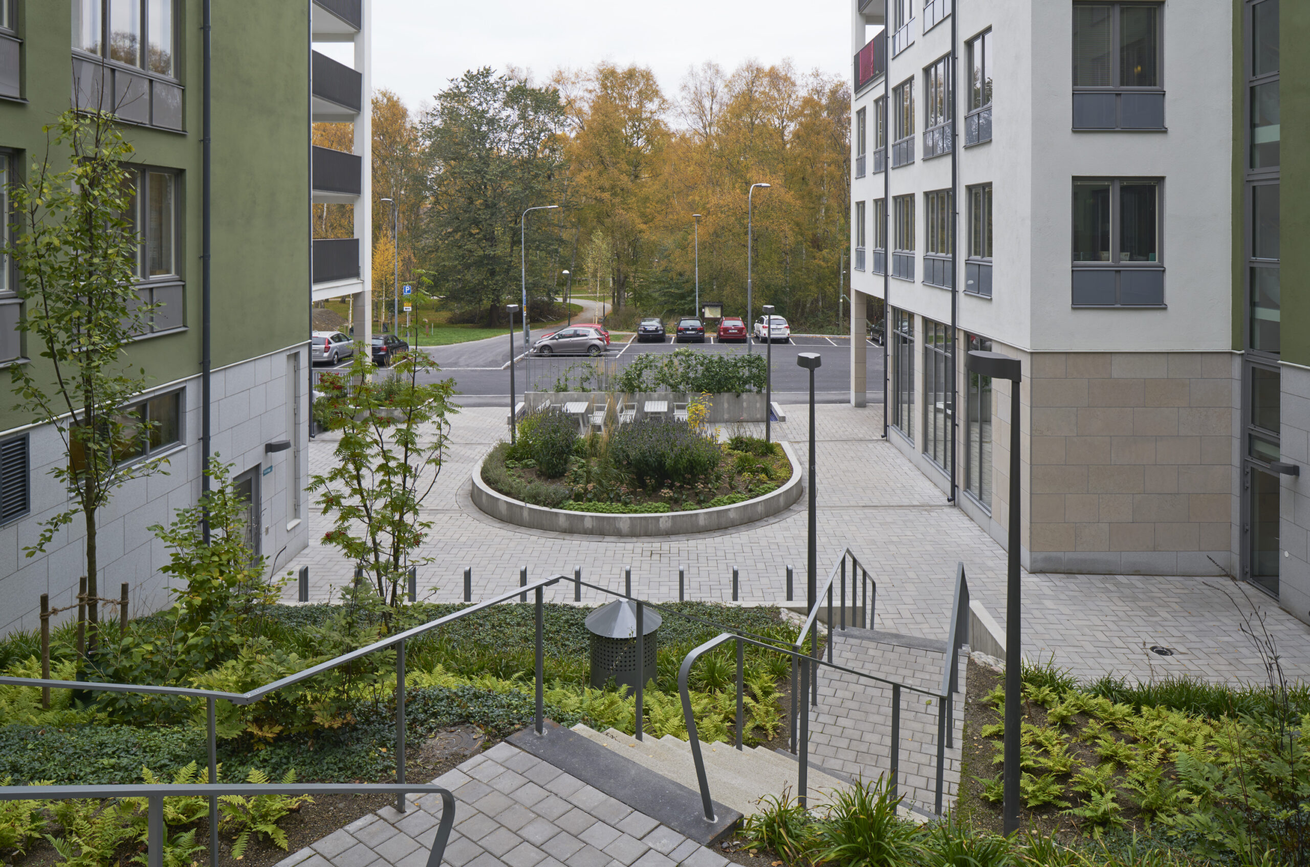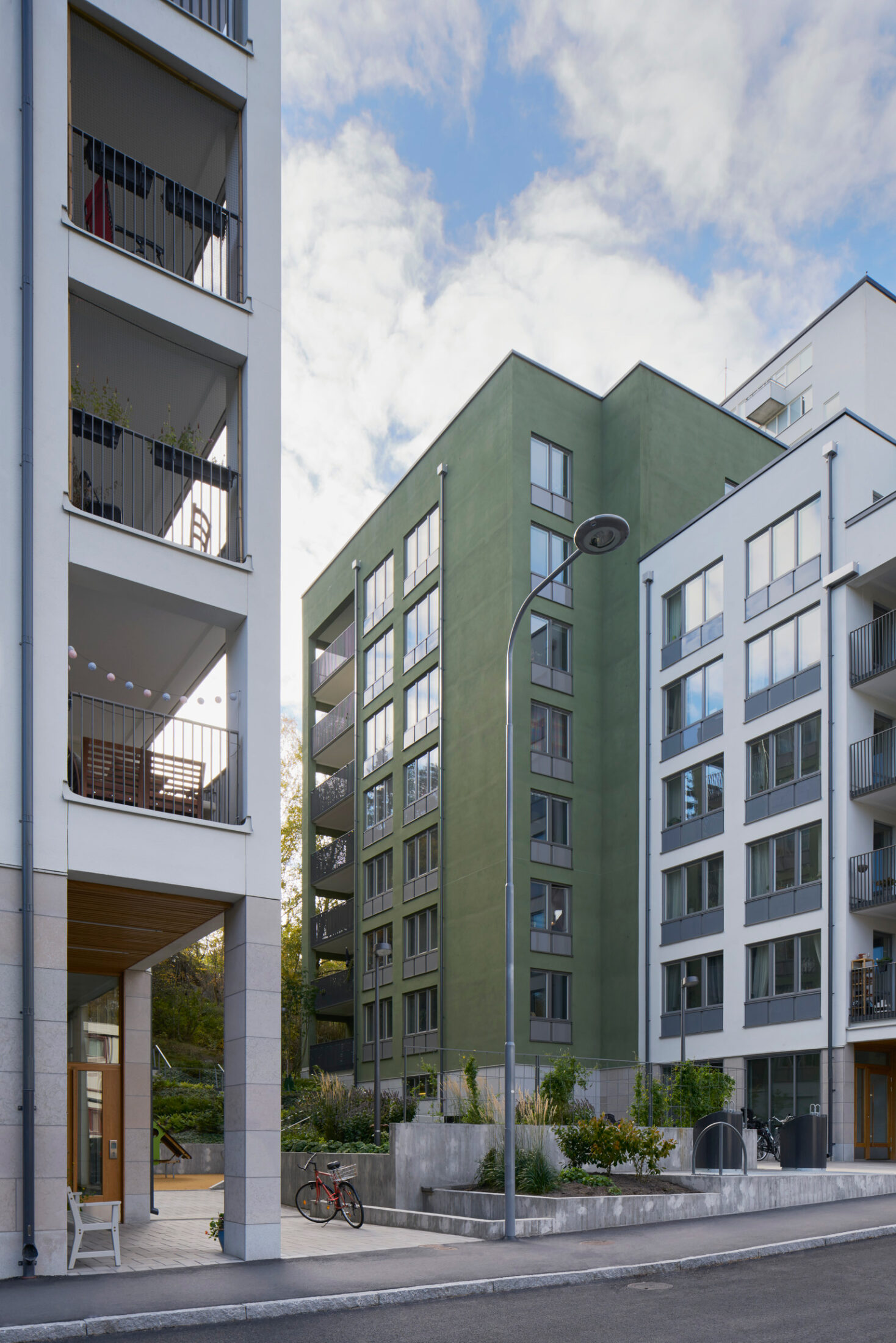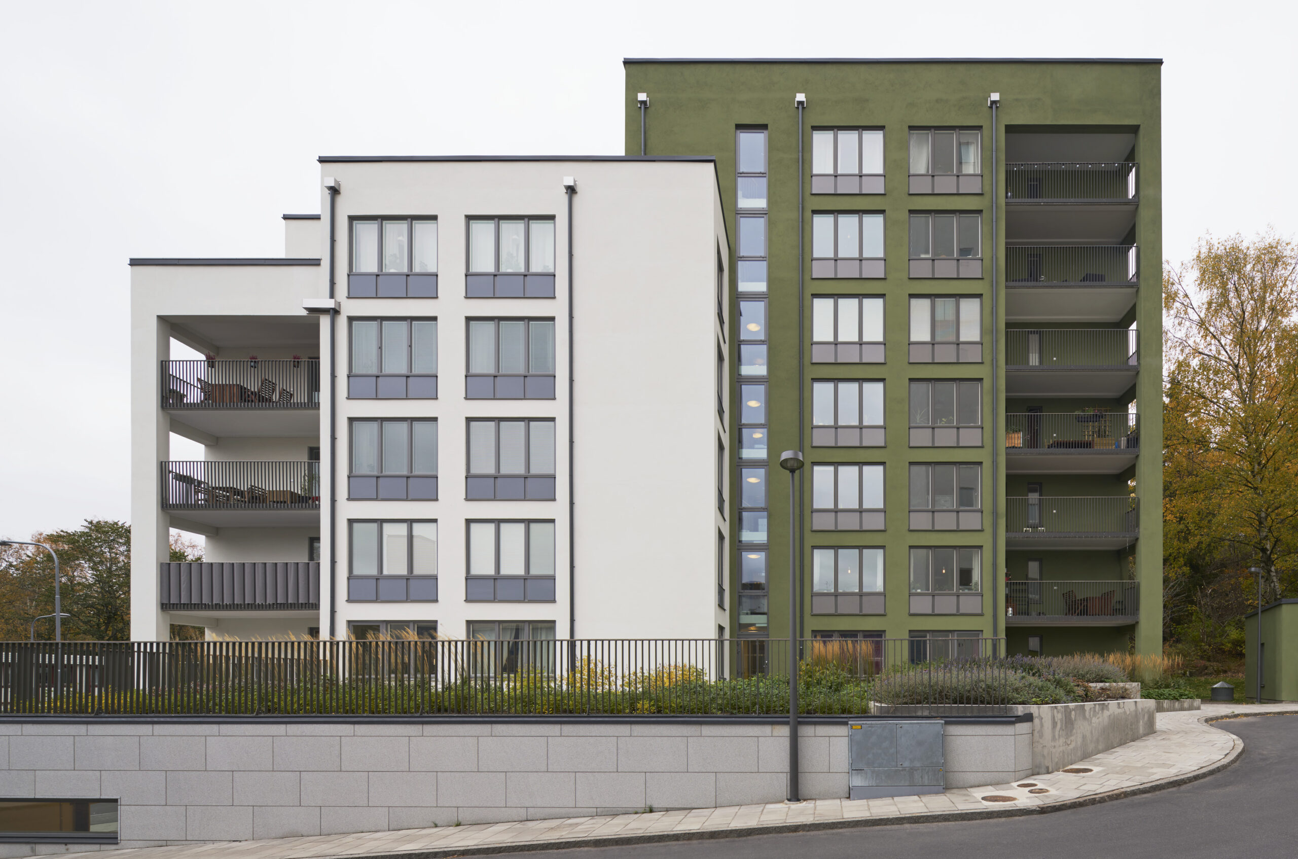 Husen är utormade så att de anknyter till den befintliga äldre centrumbebyggelsen och alla tak är gröna, klädda med sedum. Fasaderna är putsade släta utan utstickande takfötter eller fasaddelar. Balkonger är indragna som hål i fasadmuren med enkla pinnräcken och fönstersättningen är enkel. Punkthusens sockelvåningar med entréer och lokaler med högre våningshöjd är klädda i natursten. Tillbyggnaden och de lägre byggnadskropparna på punkthusen är putsade i vit kulör lika det befintliga höghuset. Punkthusens högdel är putsad i en grön kulör som ansluter mot grönskan i backen mot söder.