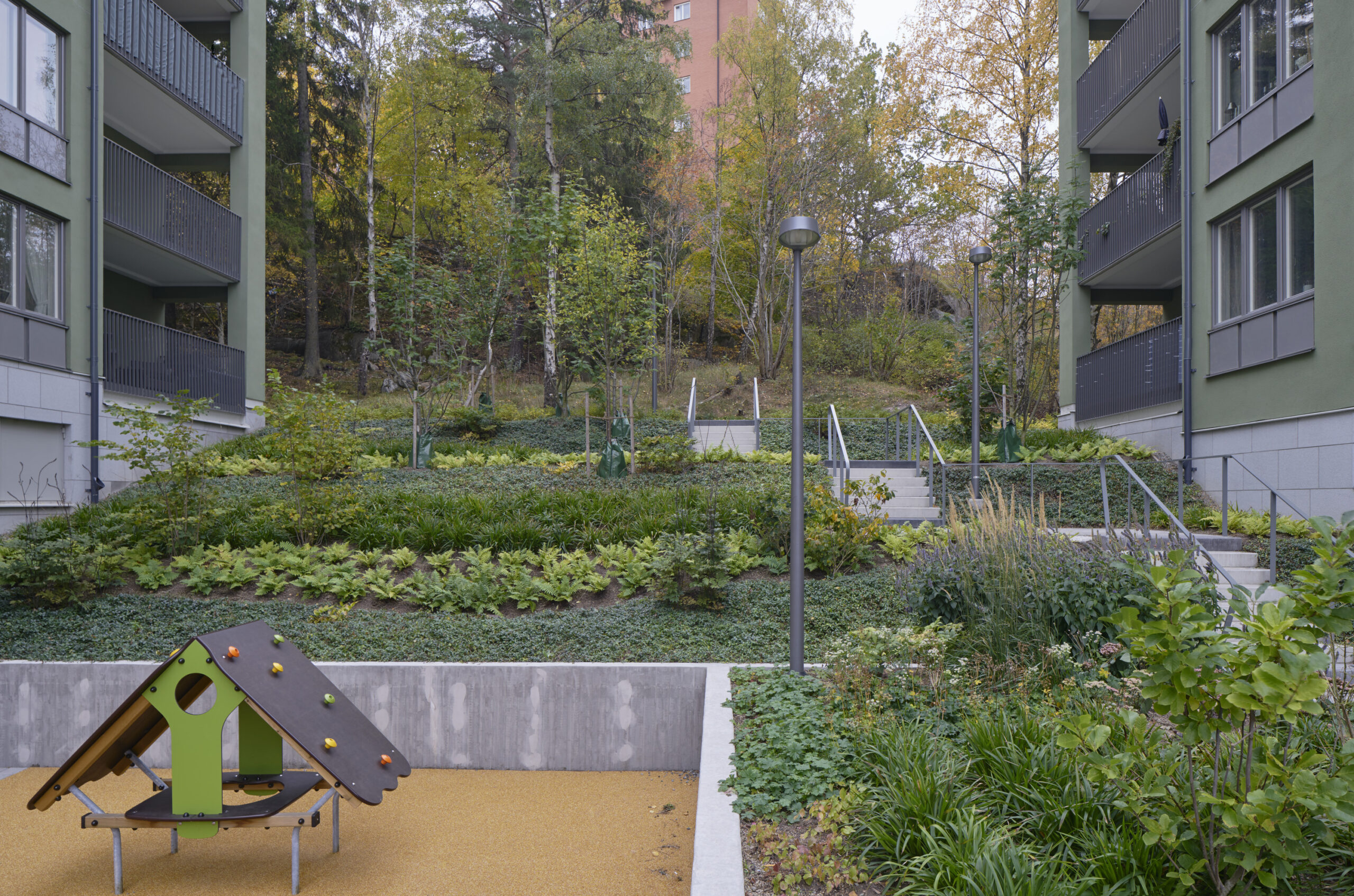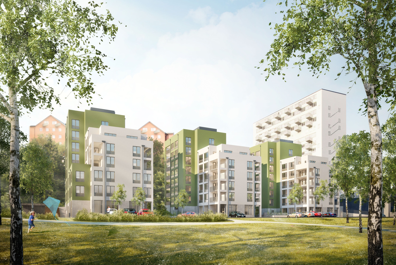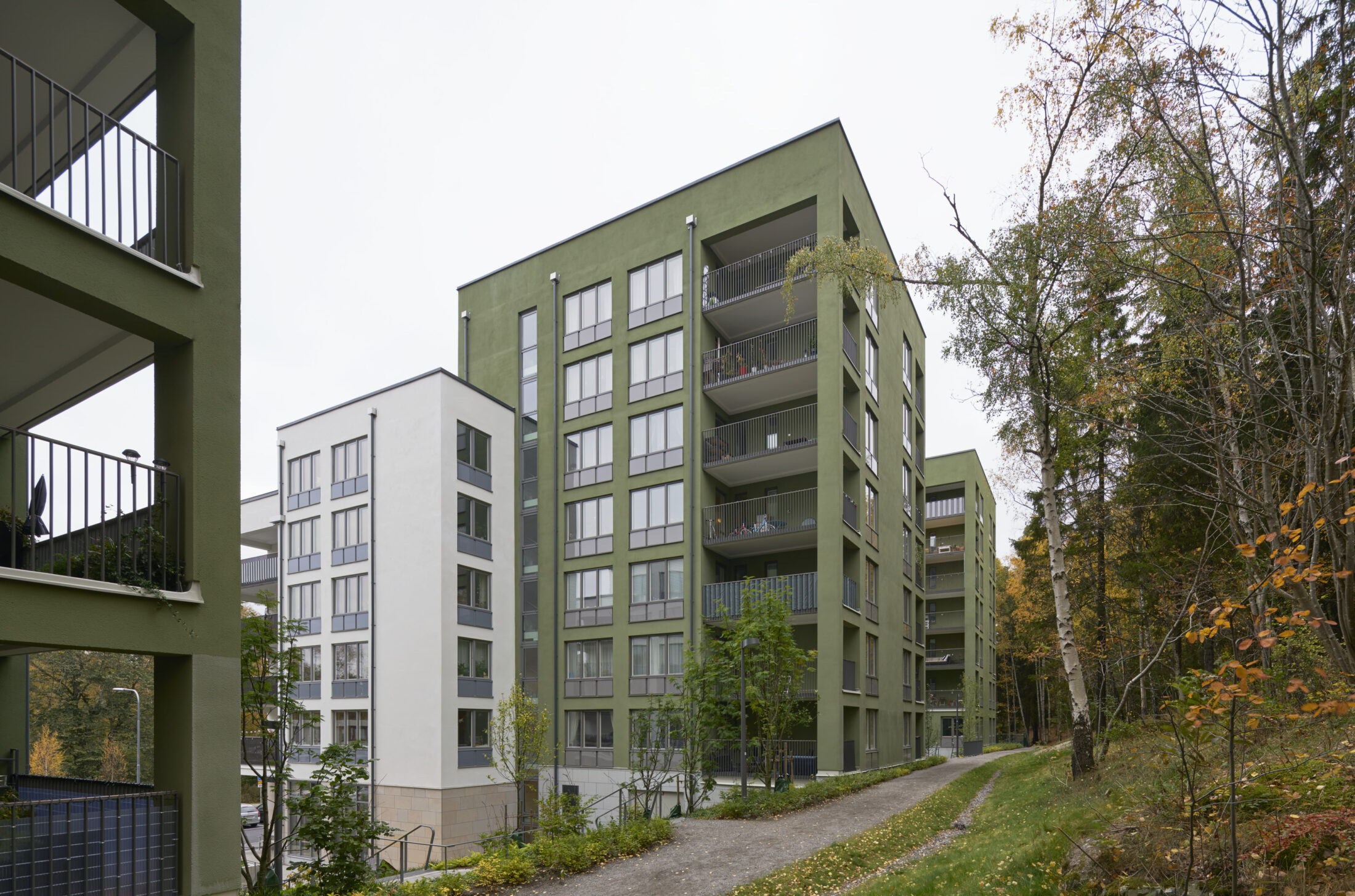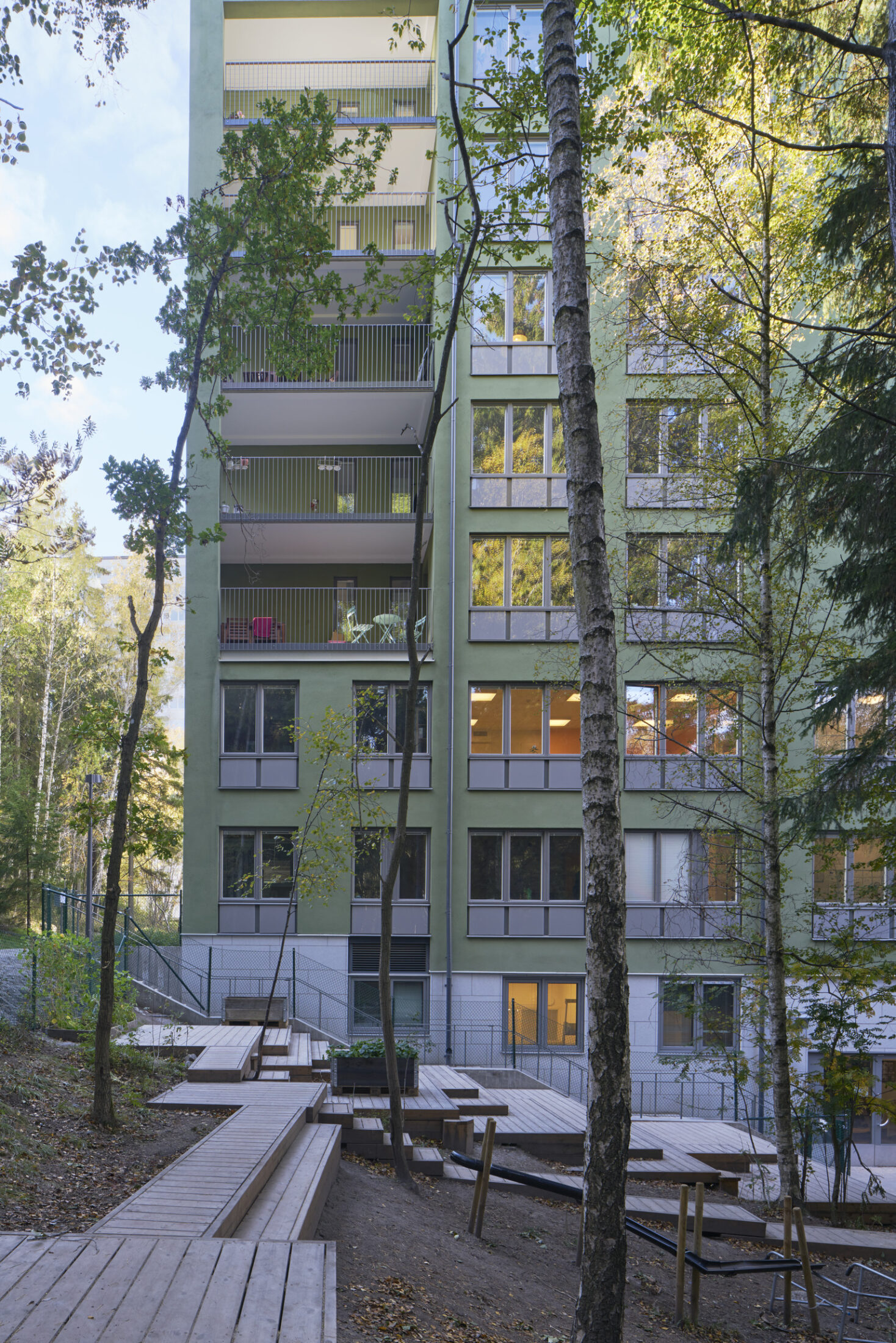 Husen är utormade så att de anknyter till den befintliga äldre centrumbebyggelsen och alla tak är gröna, klädda med sedum. Fasaderna är putsade släta utan utstickande takfötter eller fasaddelar. Balkonger är indragna som hål i fasadmuren med enkla pinnräcken och fönstersättningen är enkel. Punkthusens sockelvåningar med entréer och lokaler med högre våningshöjd är klädda i natursten. Tillbyggnaden och de lägre byggnadskropparna på punkthusen är putsade i vit kulör lika det befintliga höghuset. Punkthusens högdel är putsad i en grön kulör som ansluter mot grönskan i backen mot söder.