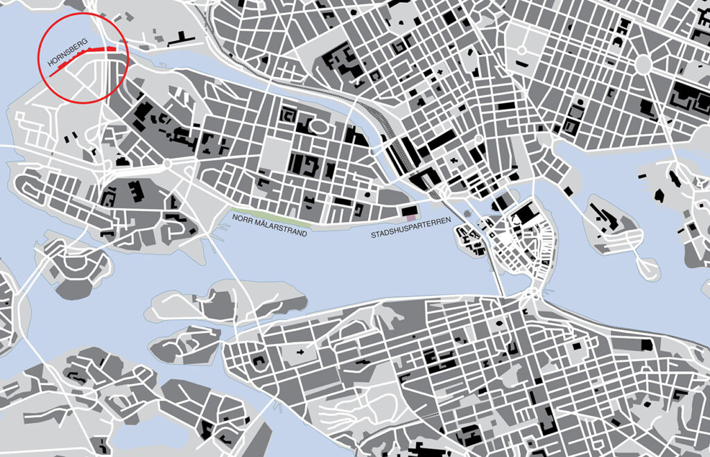 Växtmaterialet i Hornsberg är med ett undantag exotiskt, men utan att för den skull bli trädgårdsmässigt. Träden med undervegetation är placerade i täta grupper med en art i varje. I pauserna mellan trädbestånden finns öppna ytor med olika funktioner och händelser. Kanten mot vattnet är byggd av stålspont sammanbundna i vattenytan med hjälp av en stor betongkrona som spänts in i fast berg.