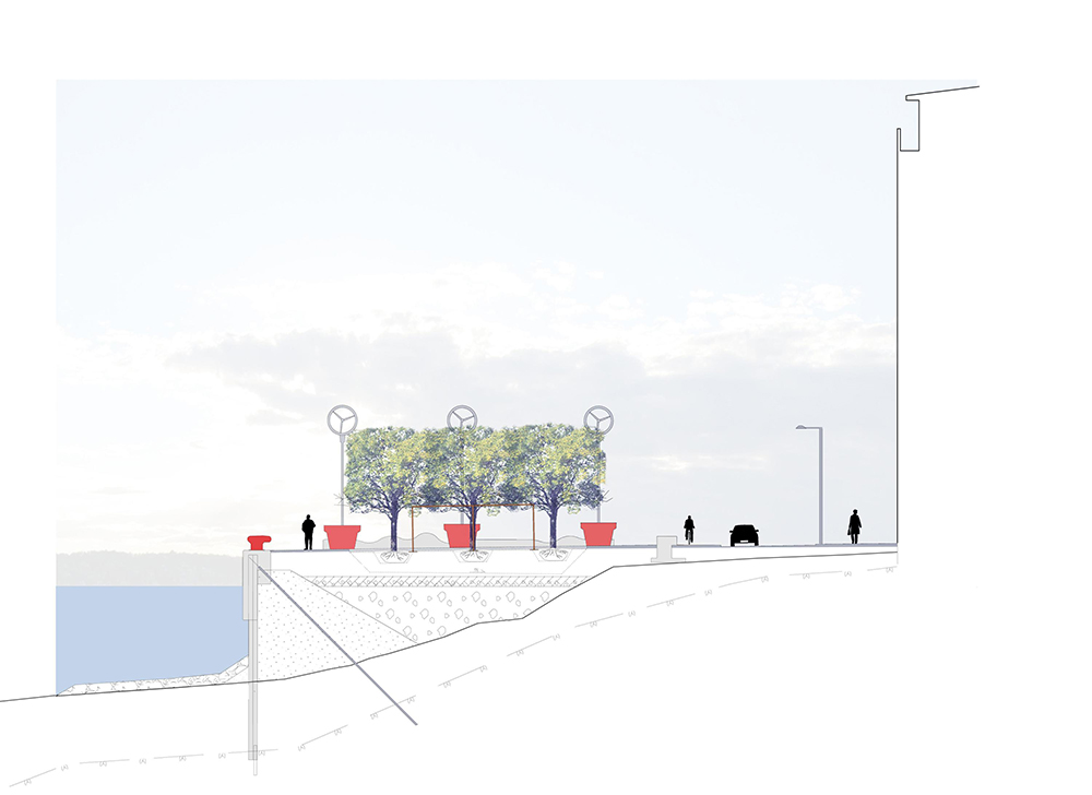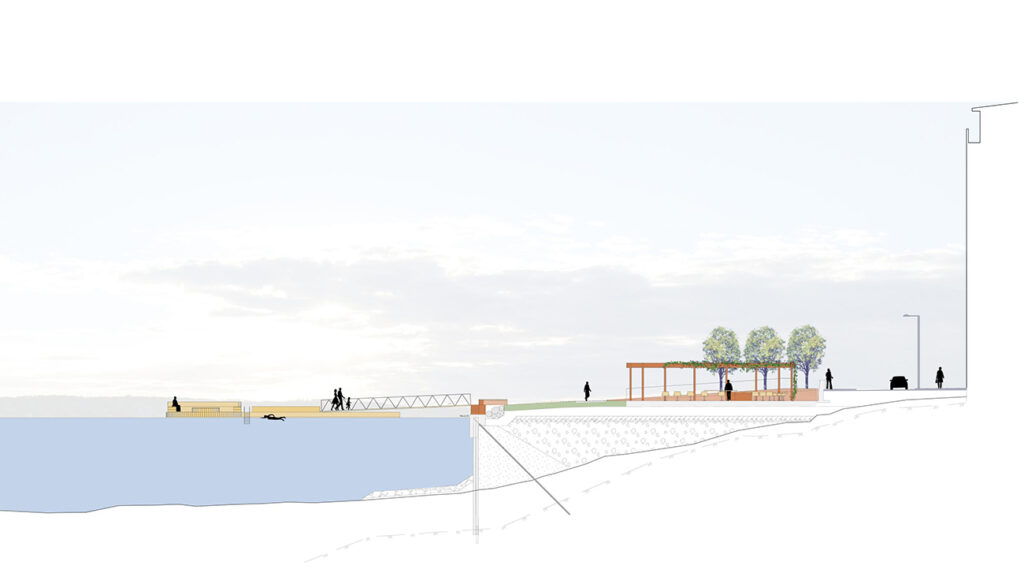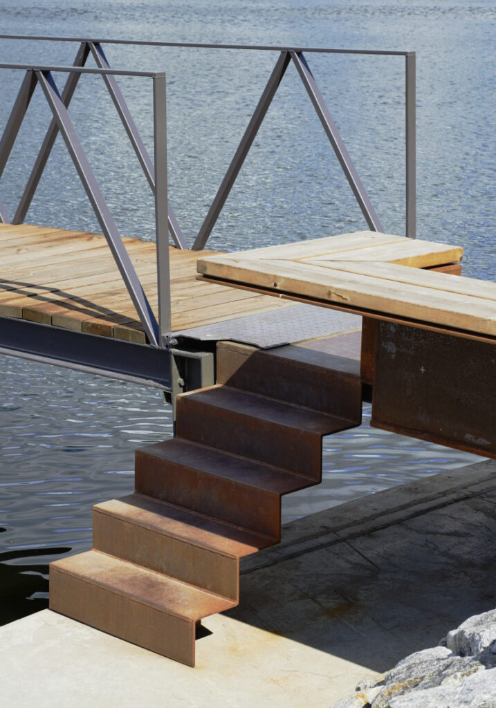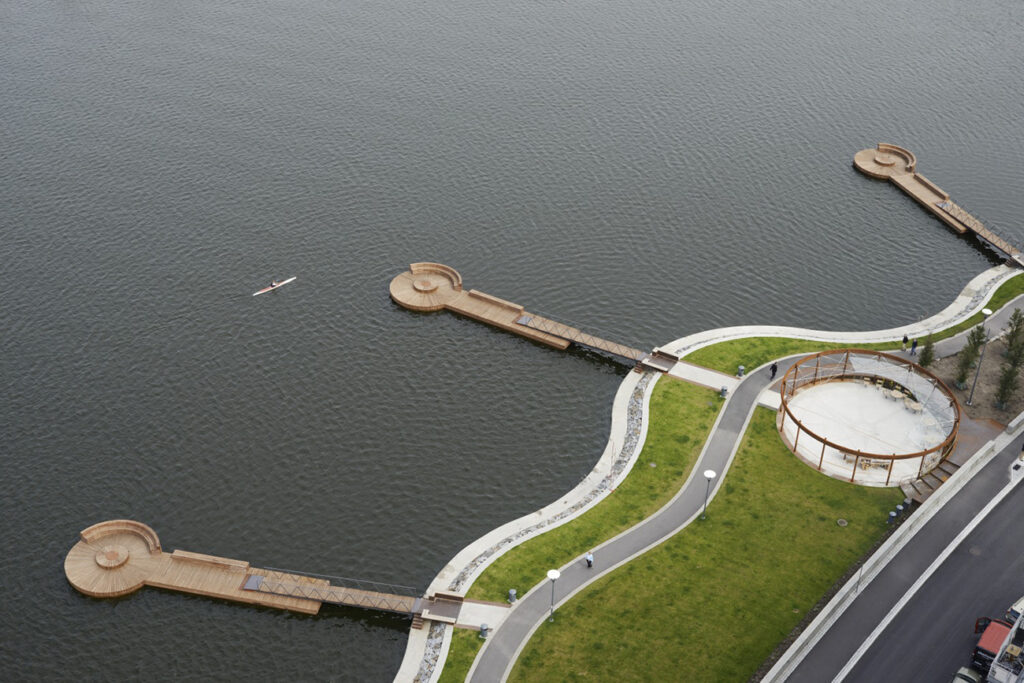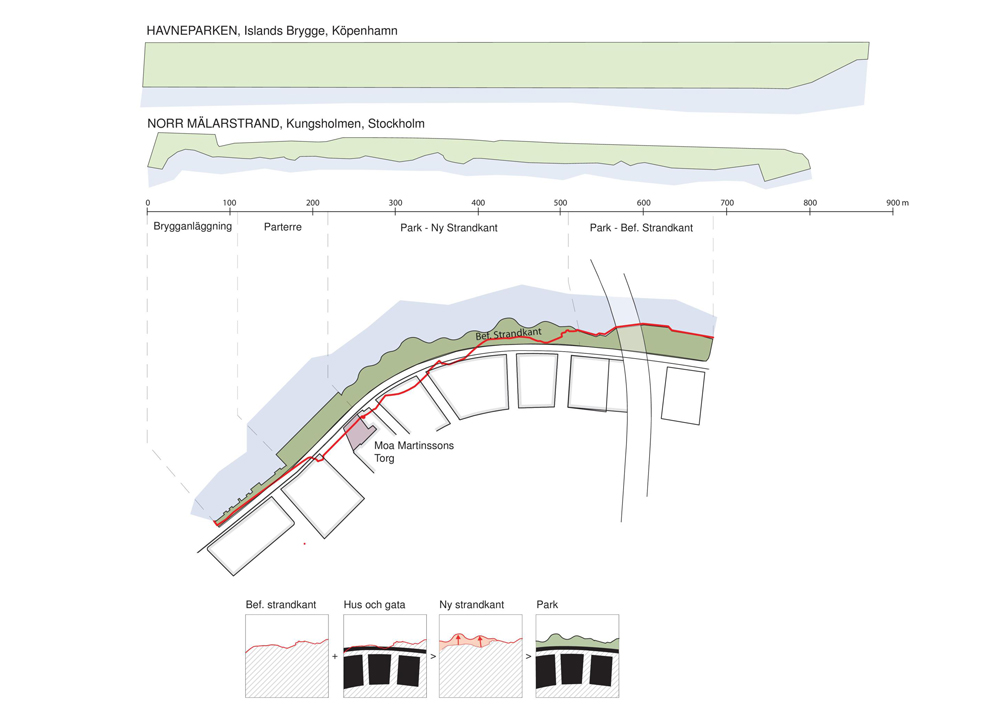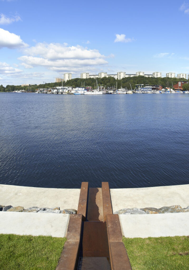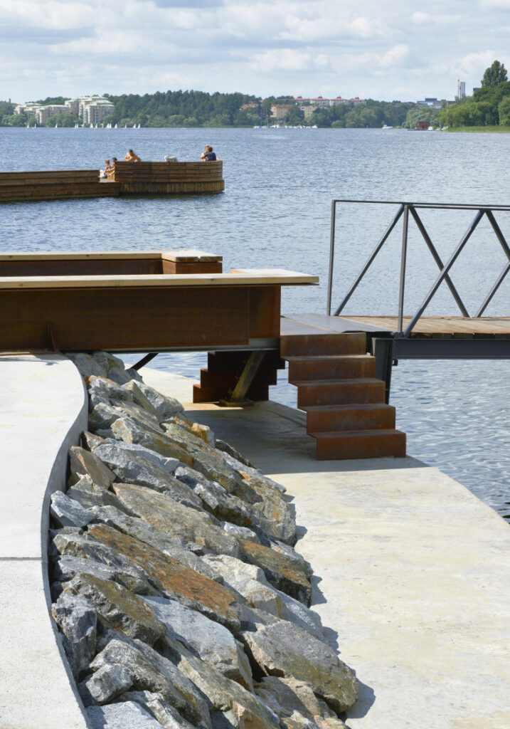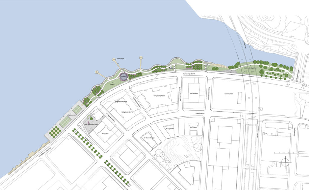 Parken är över 700 meter lång och består av fyra delar. I väster ligger en brygganläggning för solbad med träbryggor som skjuter ut i sjön i olika längder. Öster därom ligger Kajparterren som är formad i kontrast mot den organiska Strandparken. Den ligger som en något upphöjd horisontell skiva som svagt lutar mot sjön. Längst i öster ligger en befintlig del som byggts om för att bli mer tillgänglig.