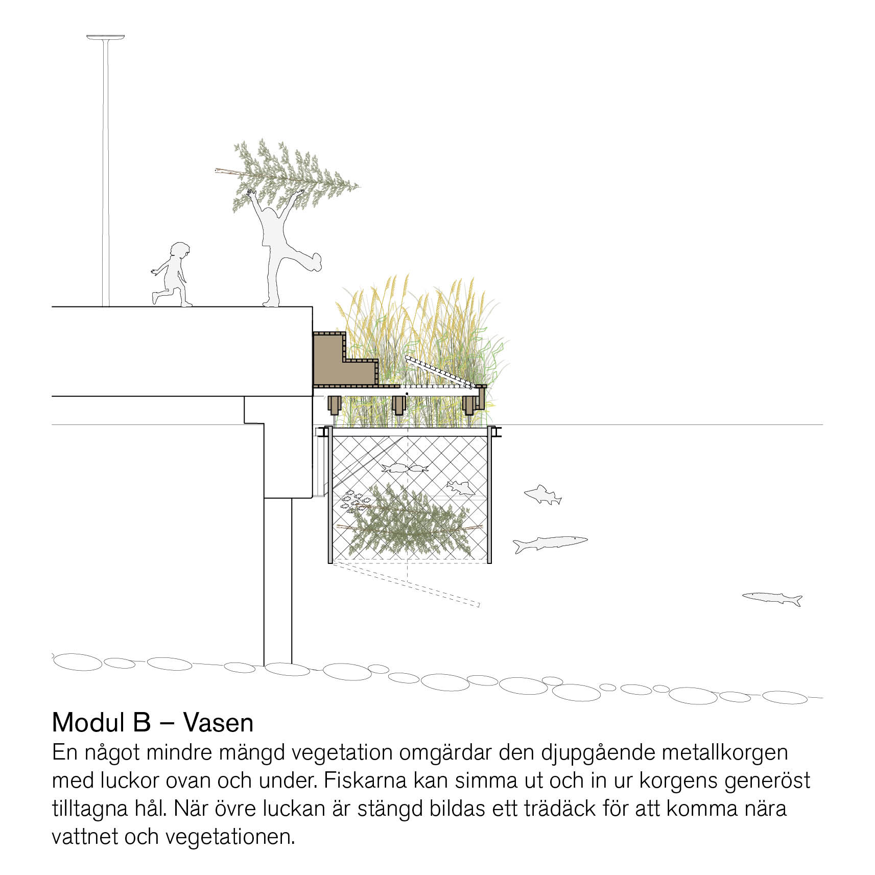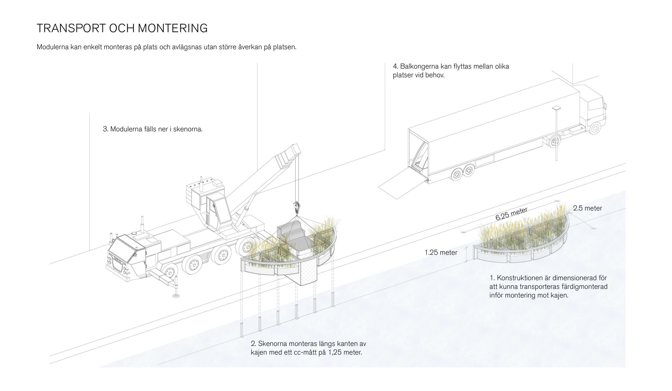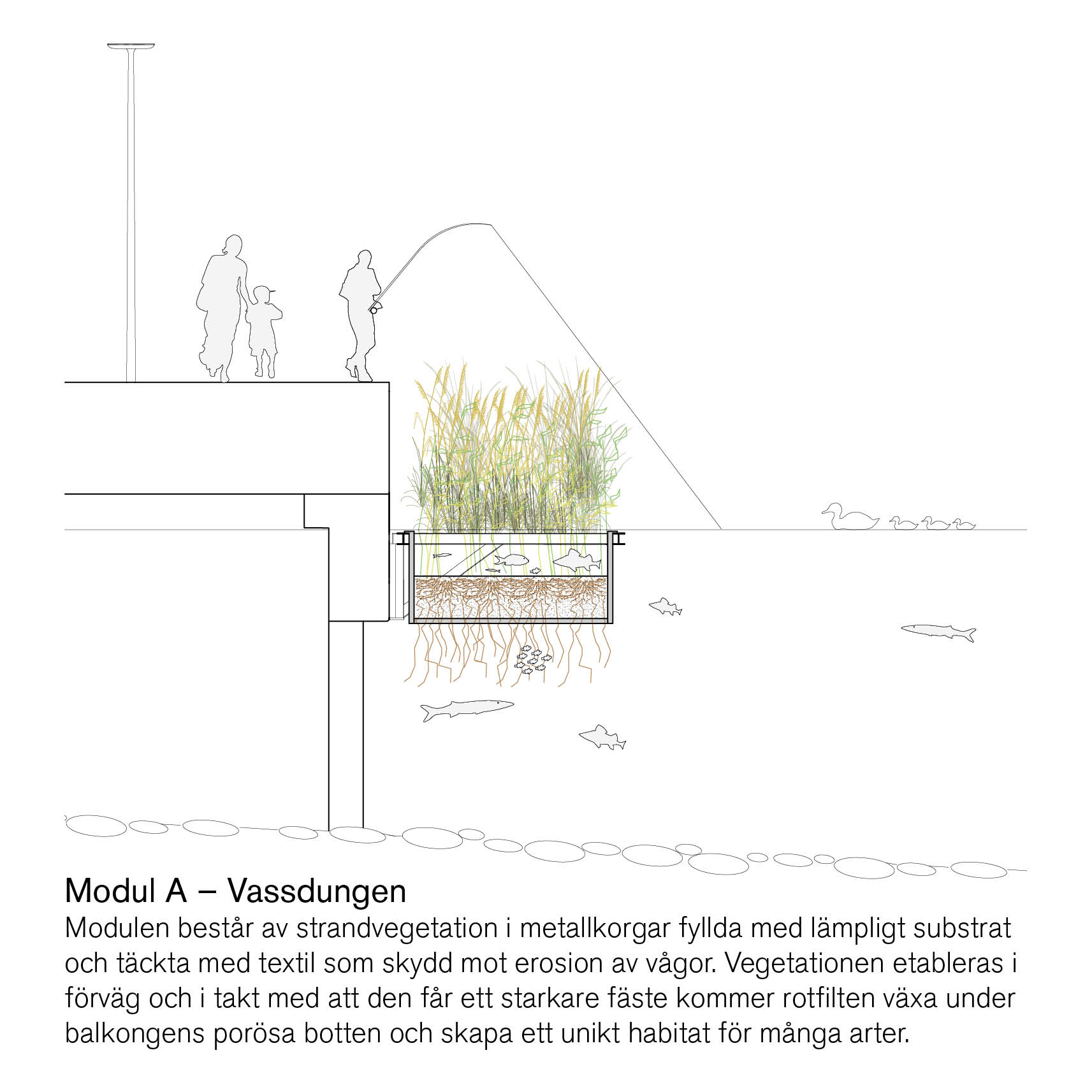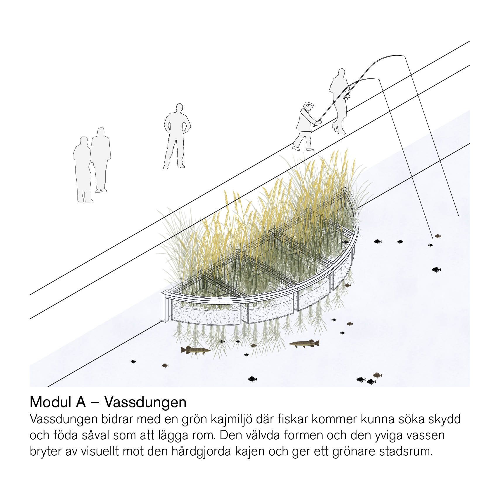 För att skapa en möjlighet till etablering för växter som vass och säv krävs det grunda, mjuka bottnar som saknas i de flesta kajmiljöer. Djupen utanför dessa är för stora för dessa arter och den ständiga påverkan från båttrafiken gör etableringen svår på grundare partier. Genom att fästa hängande ”undervattensbalkonger”, fyllda med substrat kommer vegetationen tillräckligt nära ytan för att frodas och kan därmed erbjuda den livsmiljö som våra fiskarter saknar i staden. Balkongerna får en rundad gestaltning för att bli en naturlig del av kajen och ge ett mjukare möte mot vattenytan. I detta förslag presenteras tre olika moduler som bidrar till en rikare biologisk mångfald, en mer levande kajmiljö som också välkomnar invånarna att vistas närmare vattnet och ta del av allt liv som döljer sig under ytan.