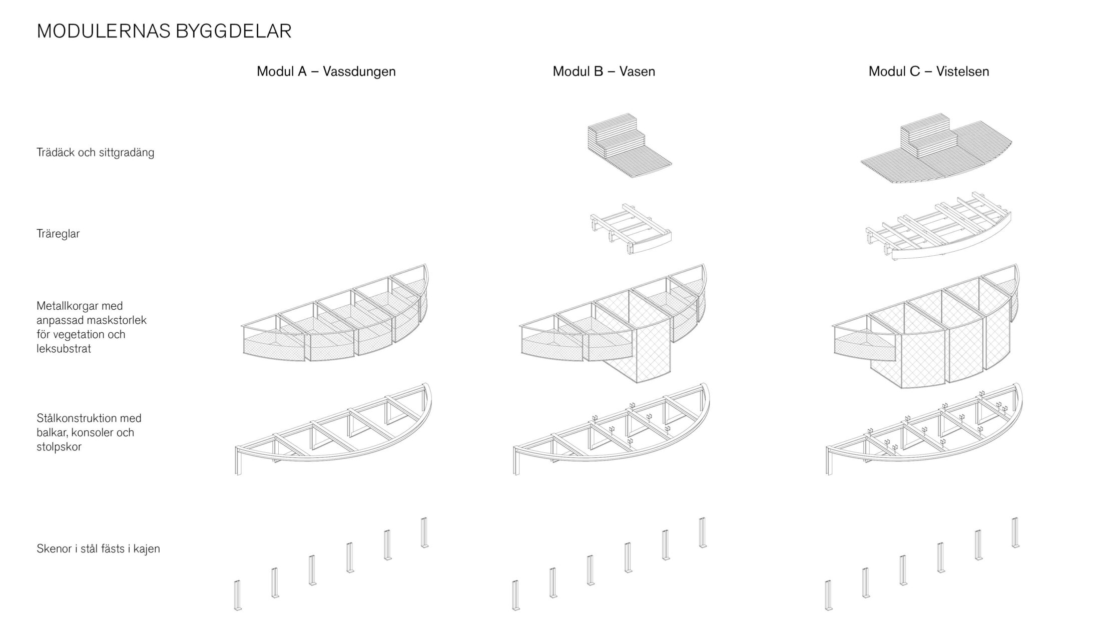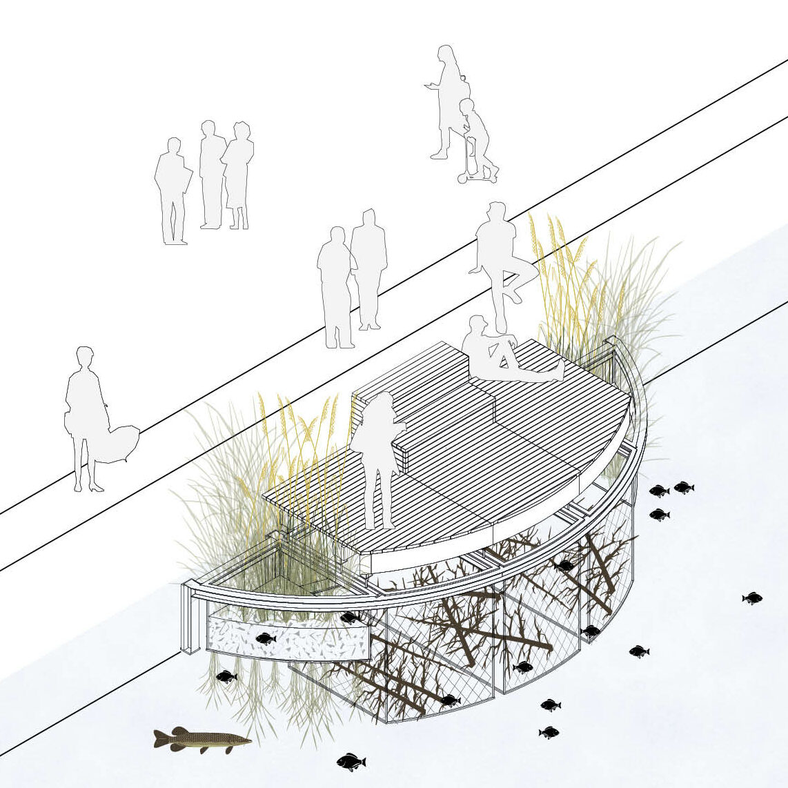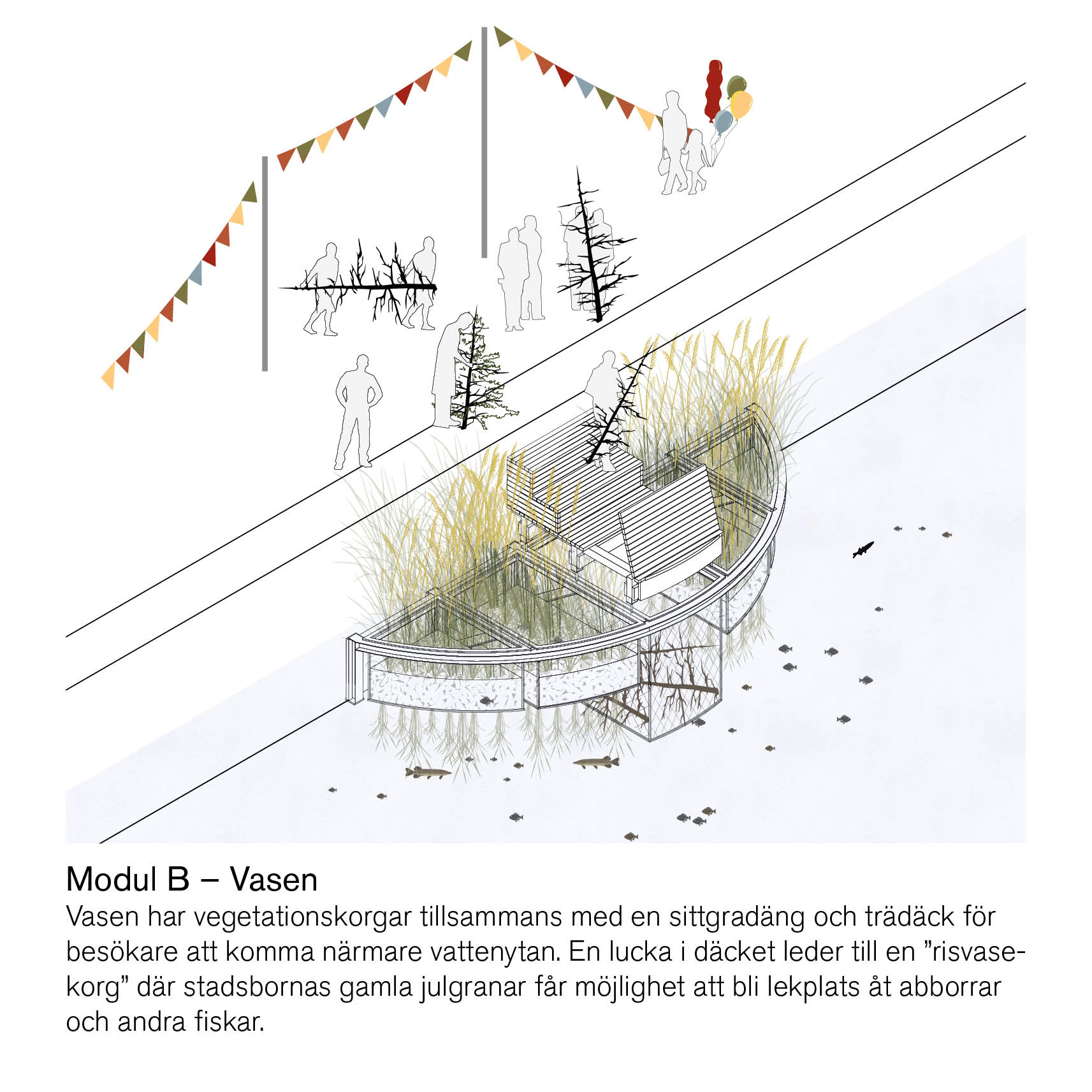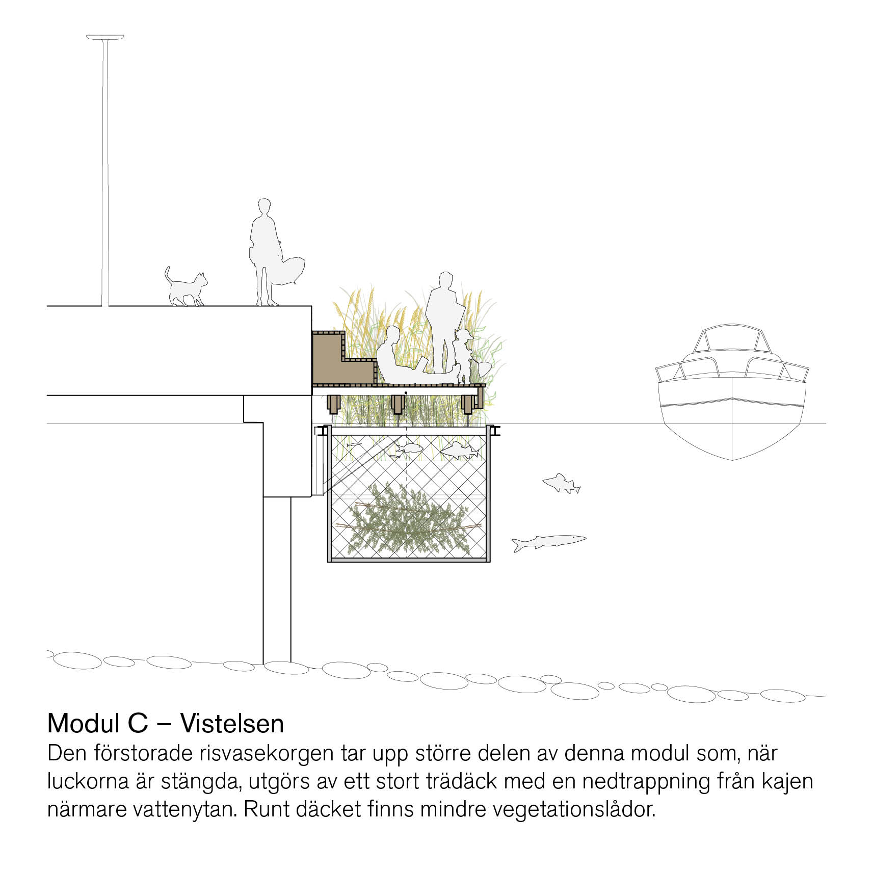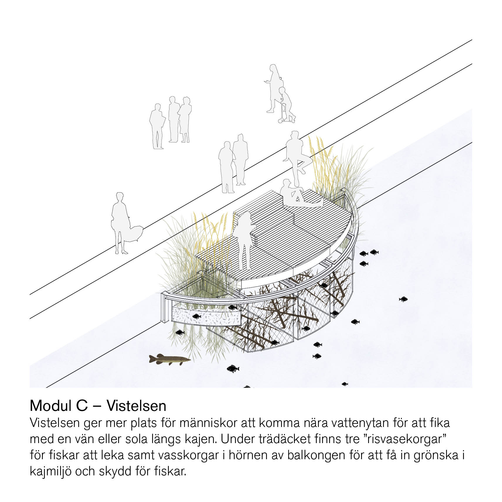 För att skapa en möjlighet till etablering för växter som vass och säv krävs det grunda, mjuka bottnar som saknas i de flesta kajmiljöer. Djupen utanför dessa är för stora för dessa arter och den ständiga påverkan från båttrafiken gör etableringen svår på grundare partier. Genom att fästa hängande ”undervattensbalkonger”, fyllda med substrat kommer vegetationen tillräckligt nära ytan för att frodas och kan därmed erbjuda den livsmiljö som våra fiskarter saknar i staden. Balkongerna får en rundad gestaltning för att bli en naturlig del av kajen och ge ett mjukare möte mot vattenytan. I detta förslag presenteras tre olika moduler som bidrar till en rikare biologisk mångfald, en mer levande kajmiljö som också välkomnar invånarna att vistas närmare vattnet och ta del av allt liv som döljer sig under ytan.