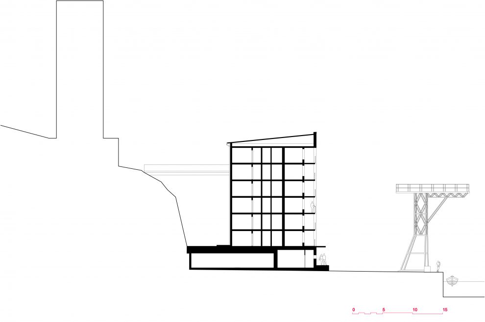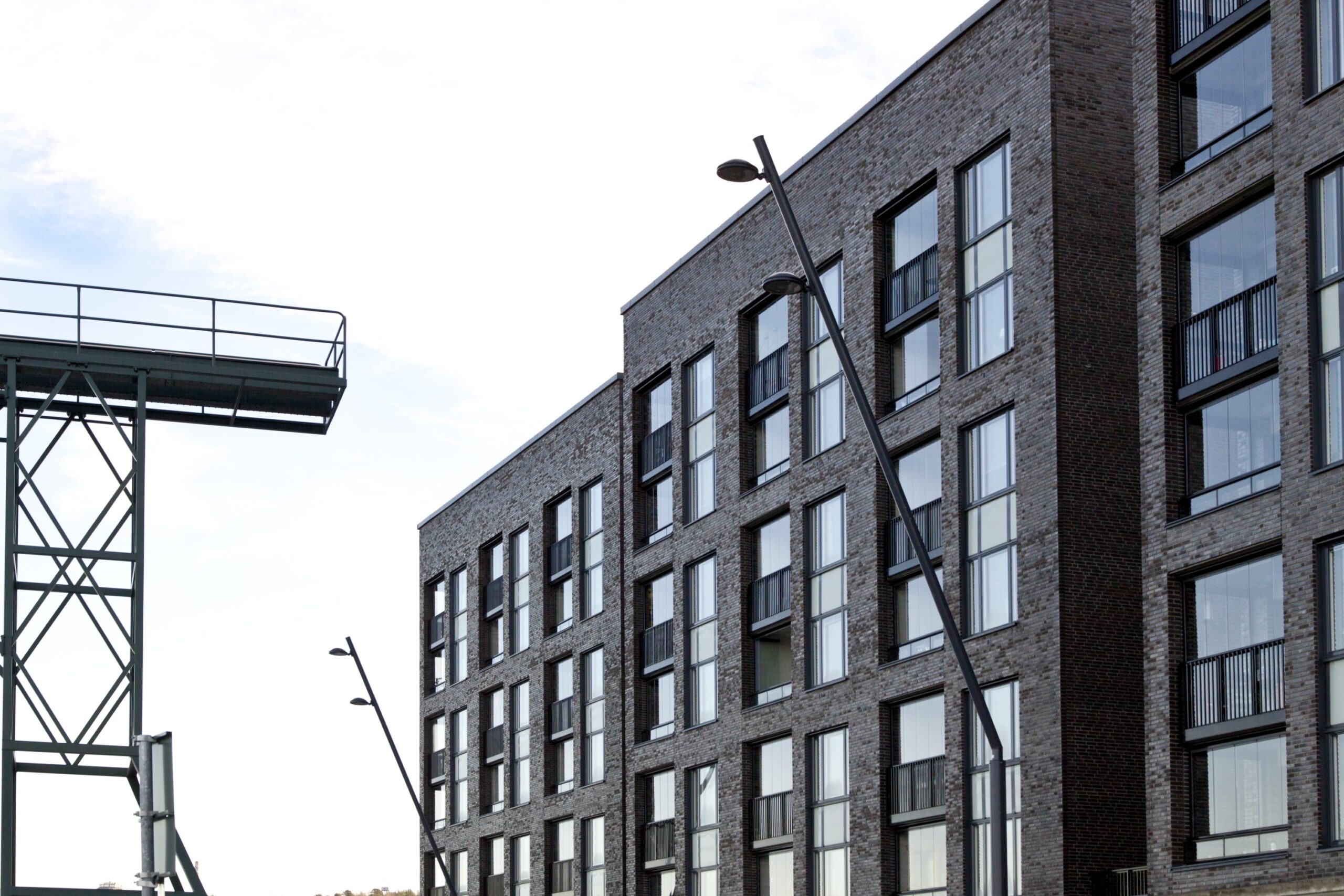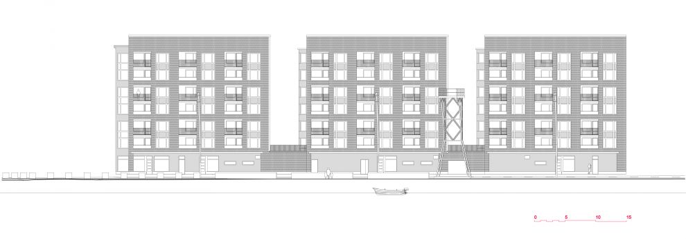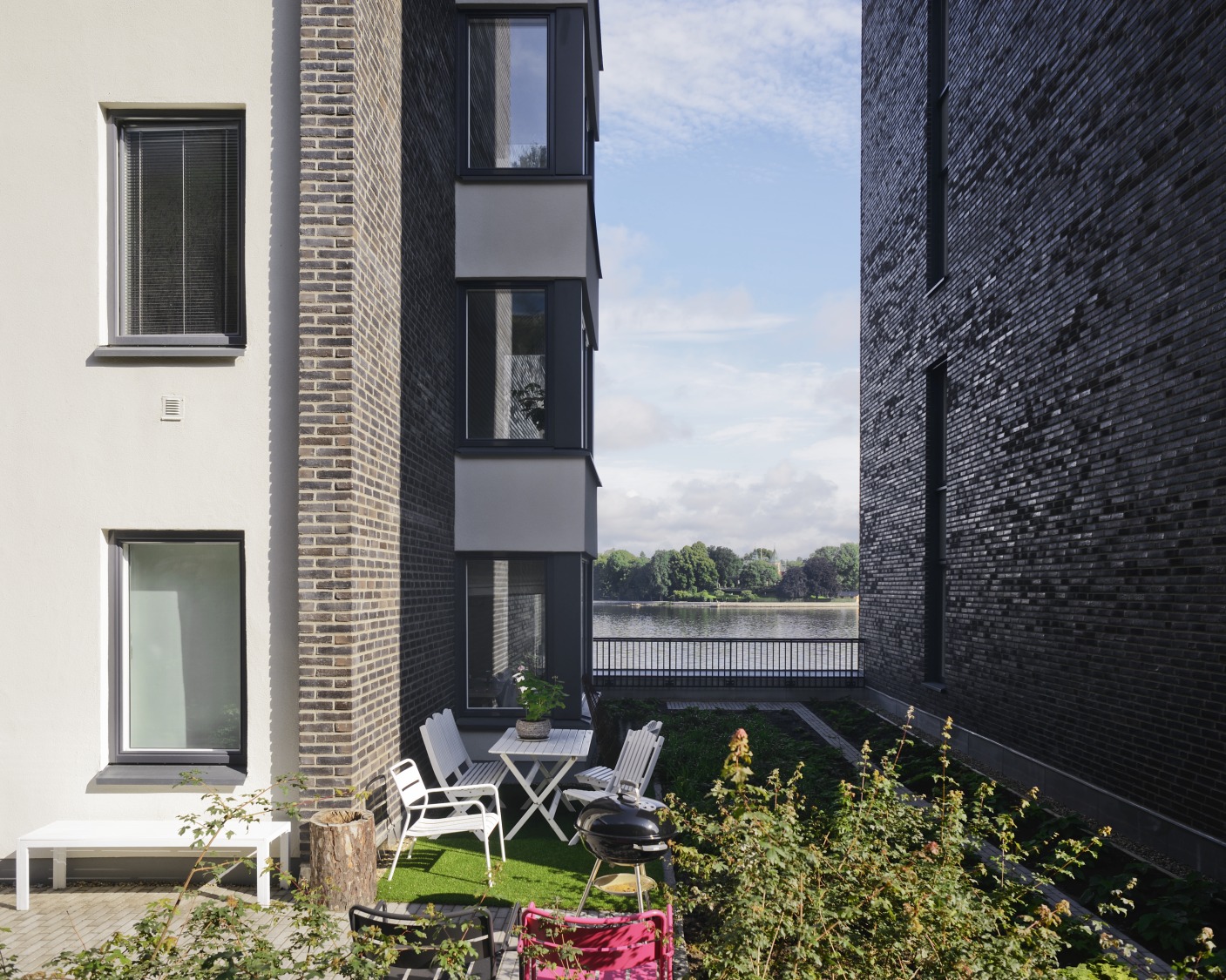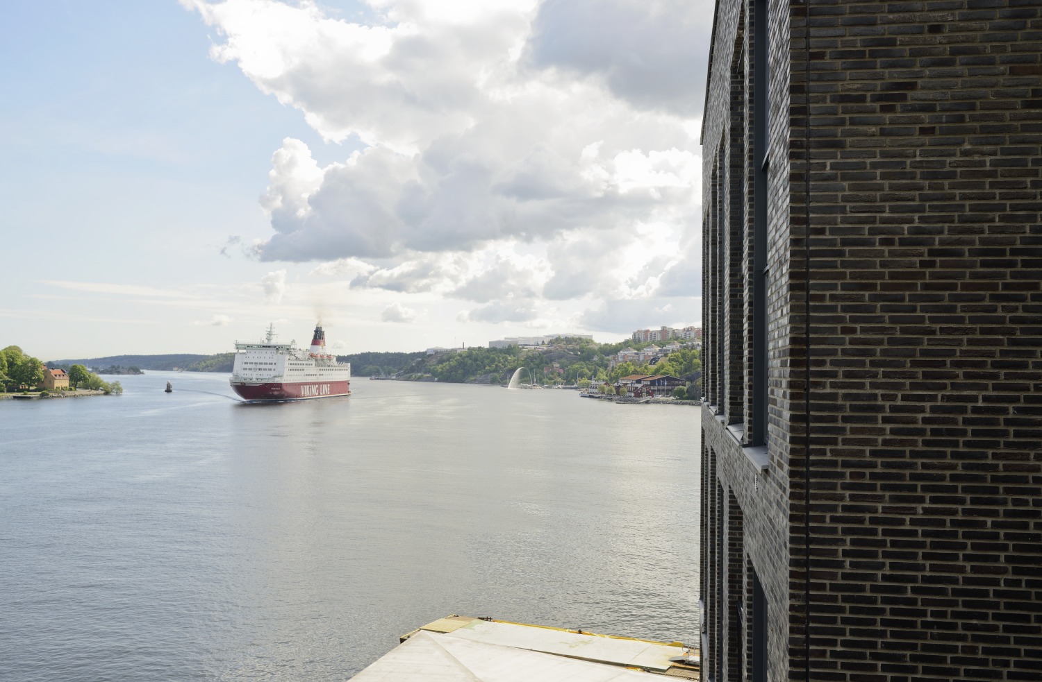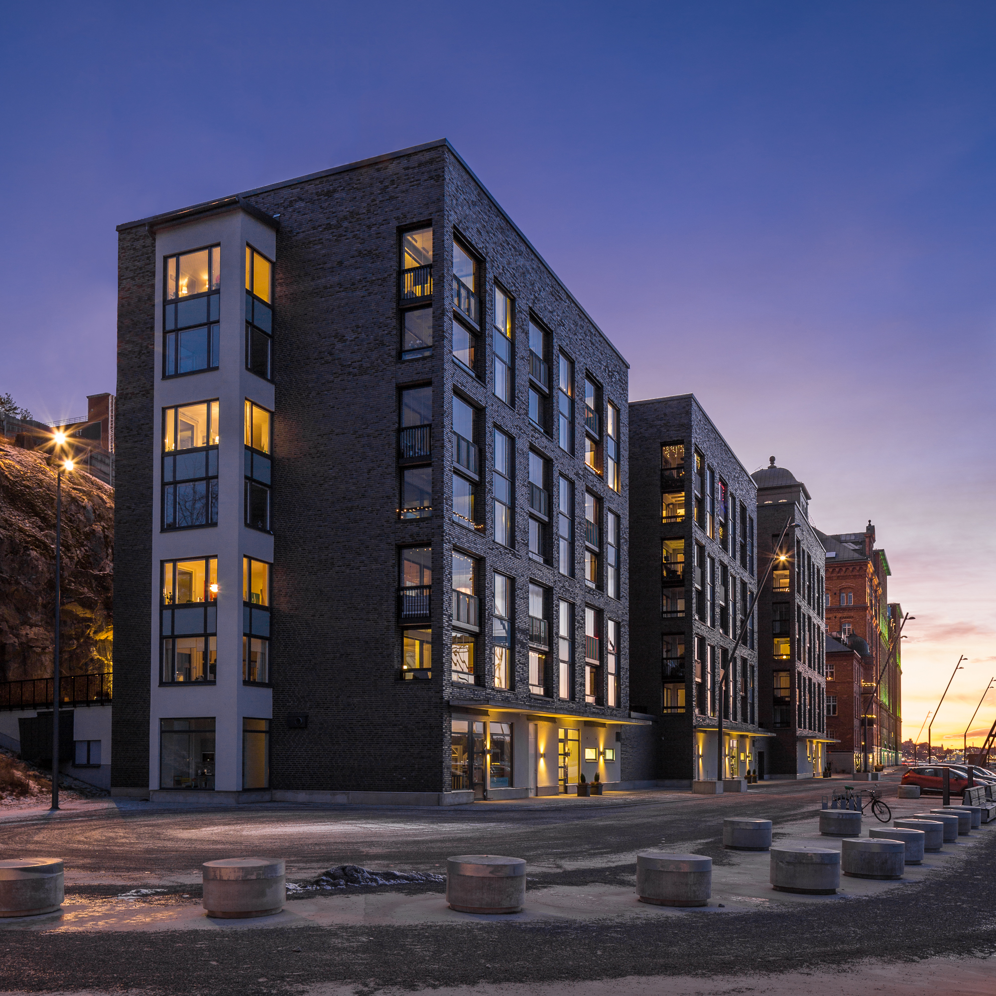 På Kvarnholmens norra strand har vi ritat tre flerbostadshus åt JM. 54 lägenheter är nu klara. Husen är utförda i mörkt tegel och har ett tvåvåningsmotiv i de indragna balkongerna mot vattnet. Skalan anknyter till Kvarnholmens industriella skala och de nya bostäderna underordnar sig de befintliga byggnaderna genom materialval och kulör mot vattnet, samt storlek och placering på kajen. Mot söder är fasaderna i ljusgrå puts och här finns en upphöjd gård.