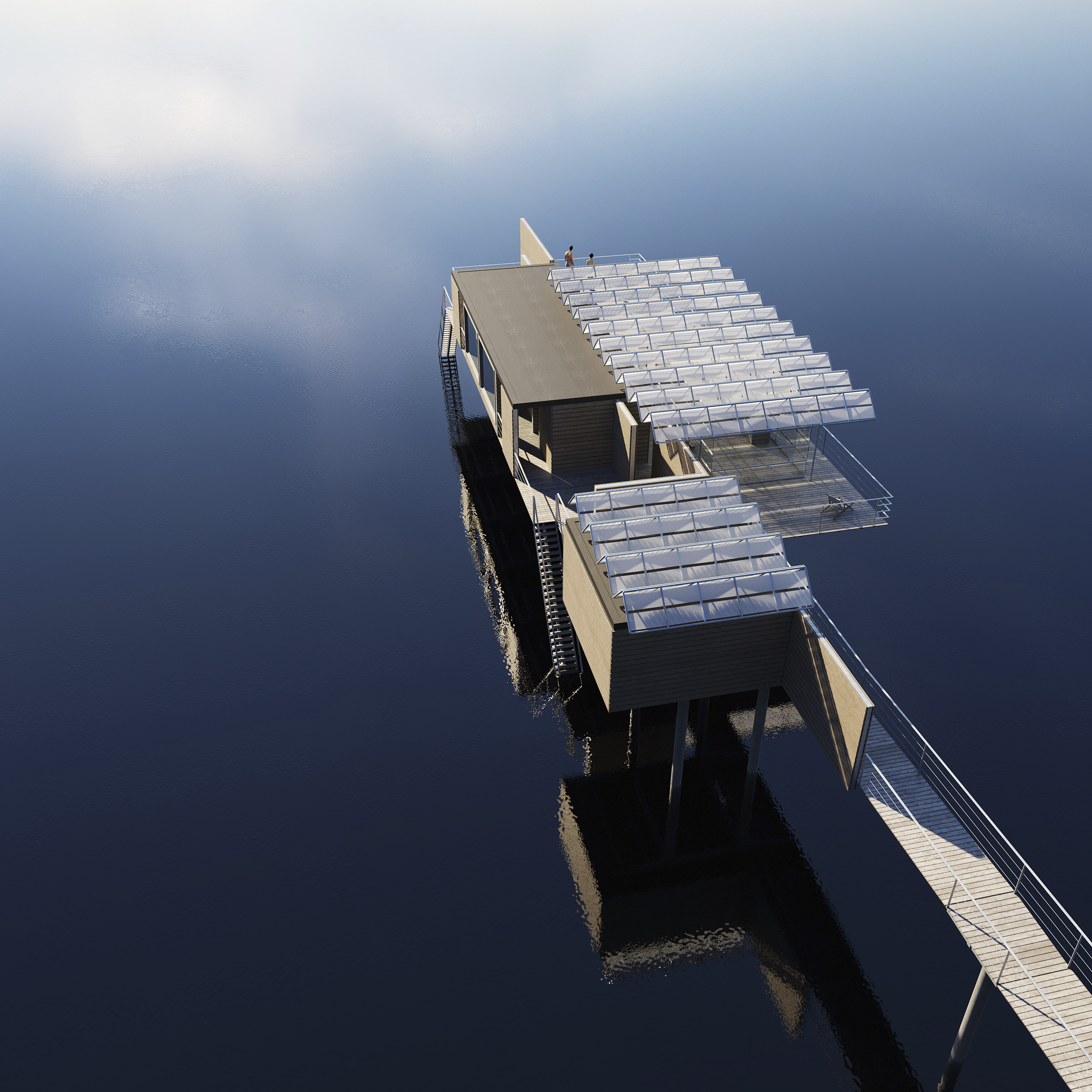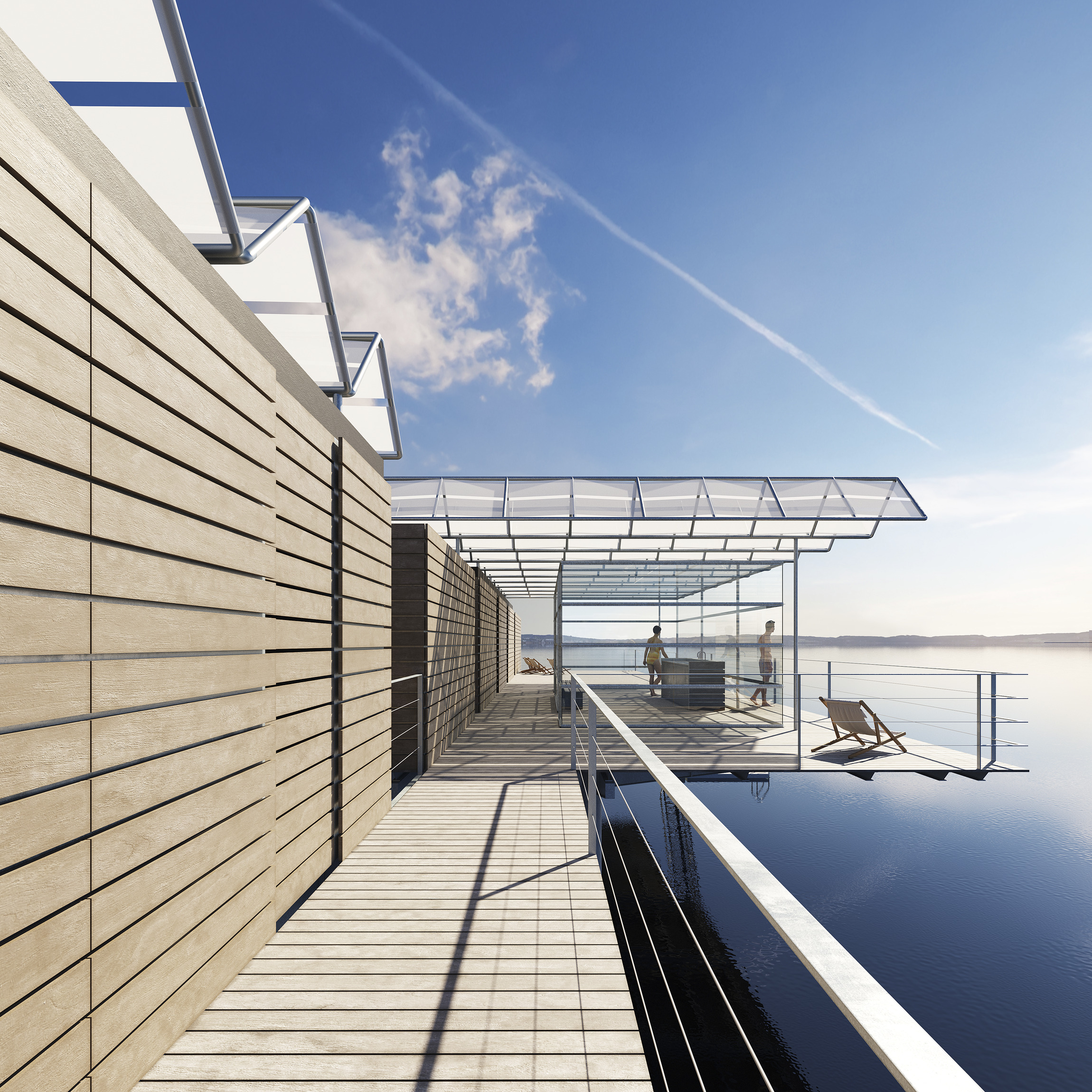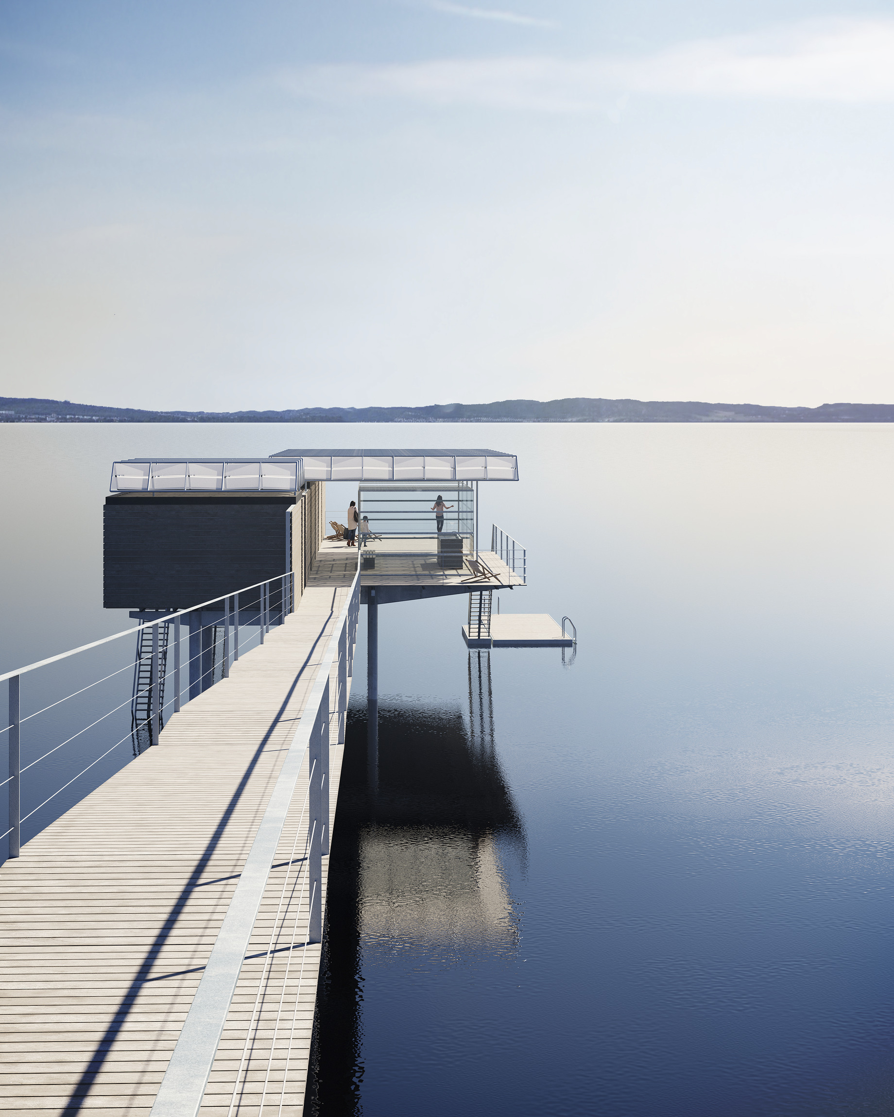 Vätterns dalgång är i huvudsak nordsydlig och Strandängen ligger på den västra stranden som har morgonsol. Genom byggnadens placering vänds det samlande Däcket mot söder. Den över 12 mil långa utsikten mot norr, mot horisonten är belöningen när man kommer till bastun. Kallbadhuset placeras så långt ut det går inom tävlingsområdet för att få så mycket kvällssol som möjligt. Den sena kvällssolen tas omhand i den uppglasade loungen. Genom att placera kallbadhuset långt åt öster ökar också vattendjupet alltmer. Ändå blir det i ”Ebba” inte mycket mer än 2 meters vattendjup. Det lämpar sig alltså inte för att dyka från Däcket. Grunda dyk från flytbryggan kan istället vara möjliga. Funktion, form och konstruktion i förening. Kallbadhuset är en utveckling av Jönköpings traditionella sätt att bygga båthus och enkla bryggor av trä som sticker rakt ut i Vättern.