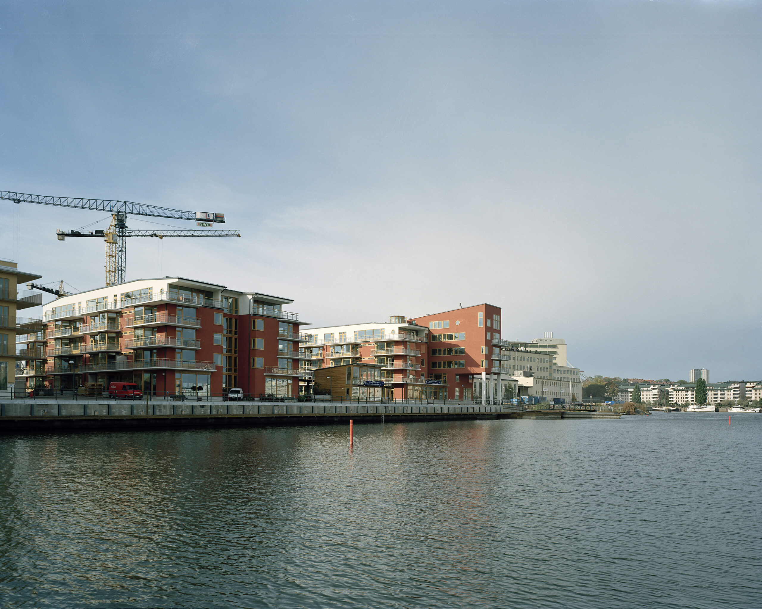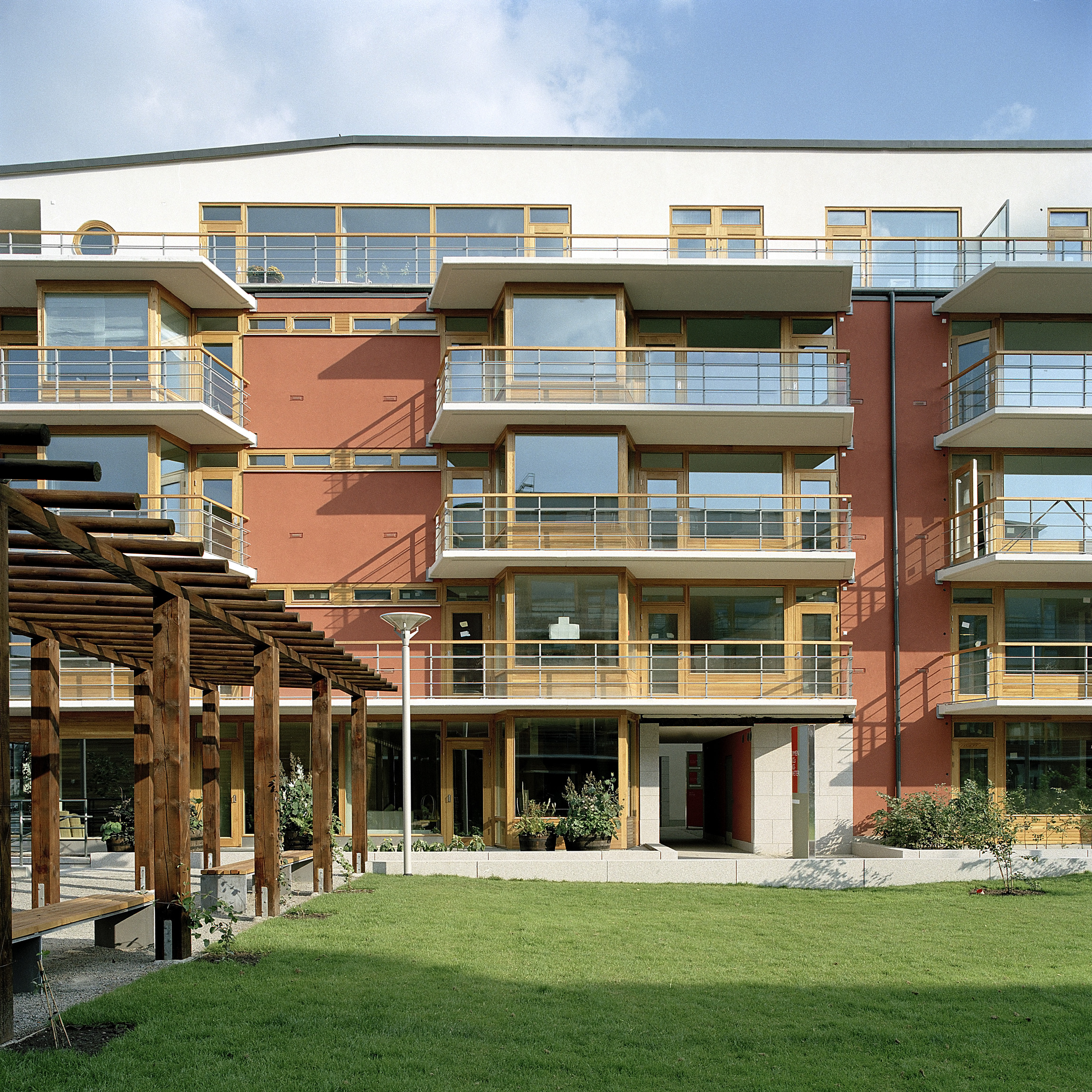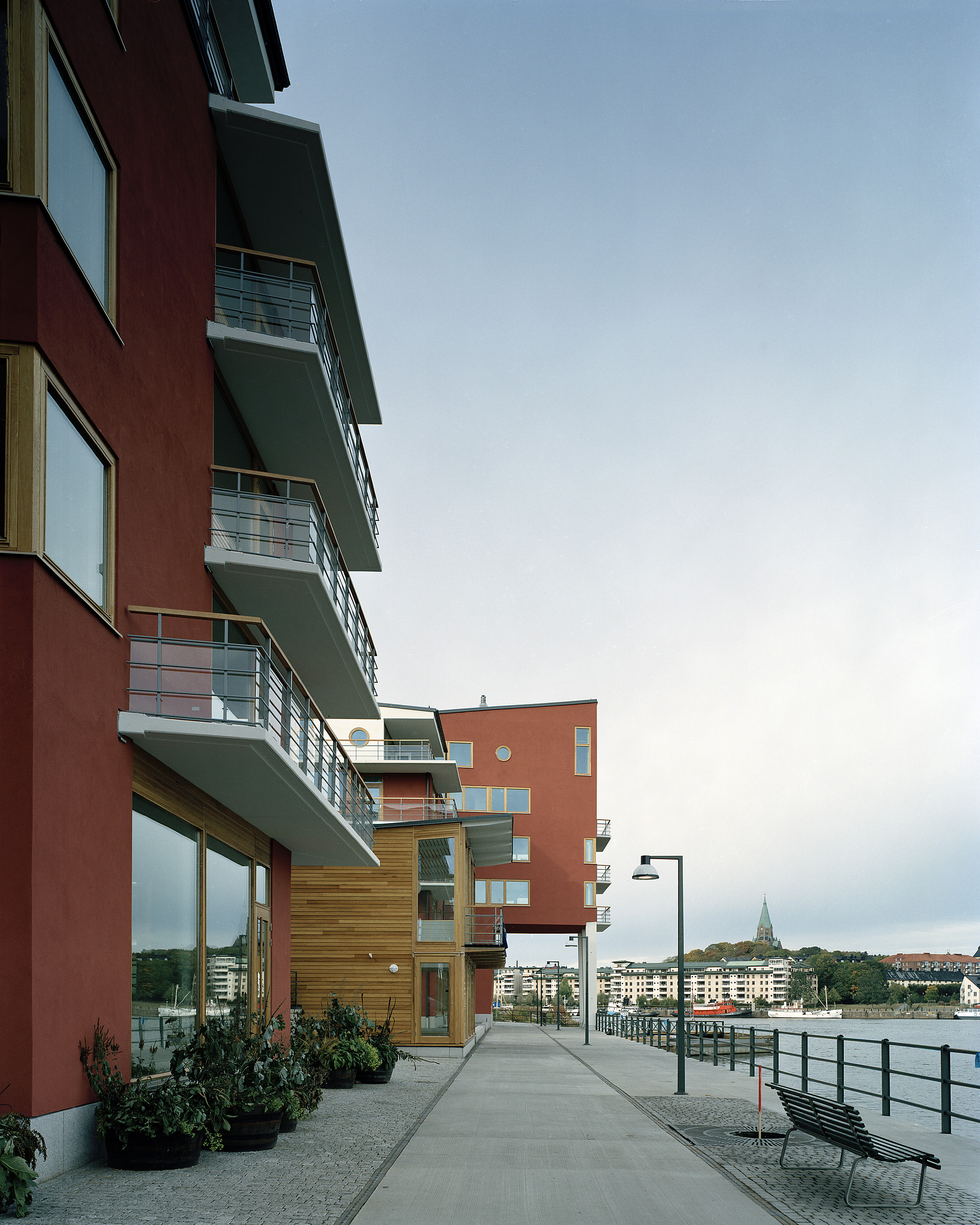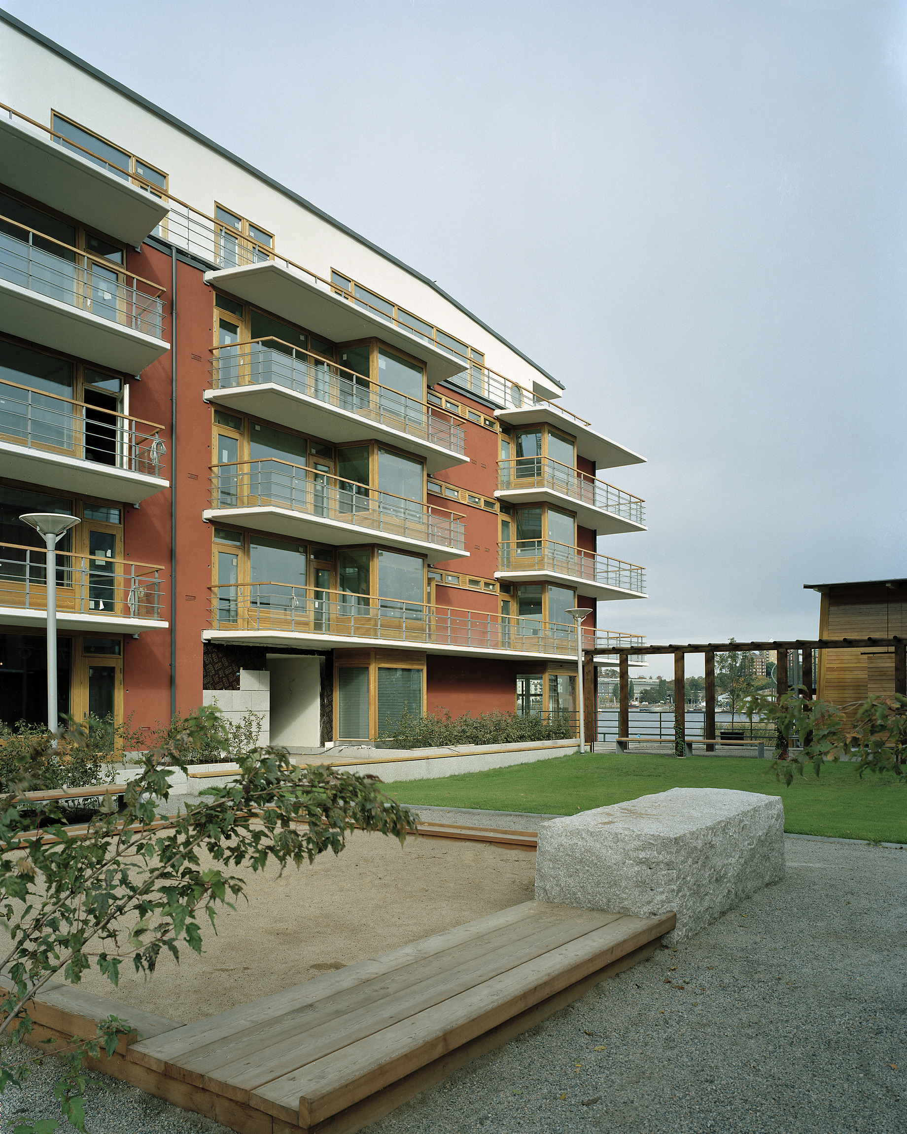 Ekfönster och glaspartier behandlade med kinesisk träolja skyddas i stor utsträckning av smäckert formade och balkongplattor i vitcement. Plattorna är omsorgsfullt arbetade med droppnäsor och plåtbelsagna anslutningar mellan betong och puts. Mark- och landskapsarbeten i parkrummet mellan husen har massiva skoningar i svensk granit. Dagvatten tas om hand ovan mark i galvaniserade öppna rännor som fällts in i markbeläggningen. Stenarbetena övergår okonstlat i skoningar av fasaderna vid entréer och portaler. Grus och gräs, plattor och smågatsten bildar en palett av markbehandlingar som varieras för att passa i helheten. Ett kontemplativt avstannande uppnås med grusbeläggning och vattenspeglar på de små vindskyddade atriumgårdarna där bostadsentréerna mynnar.