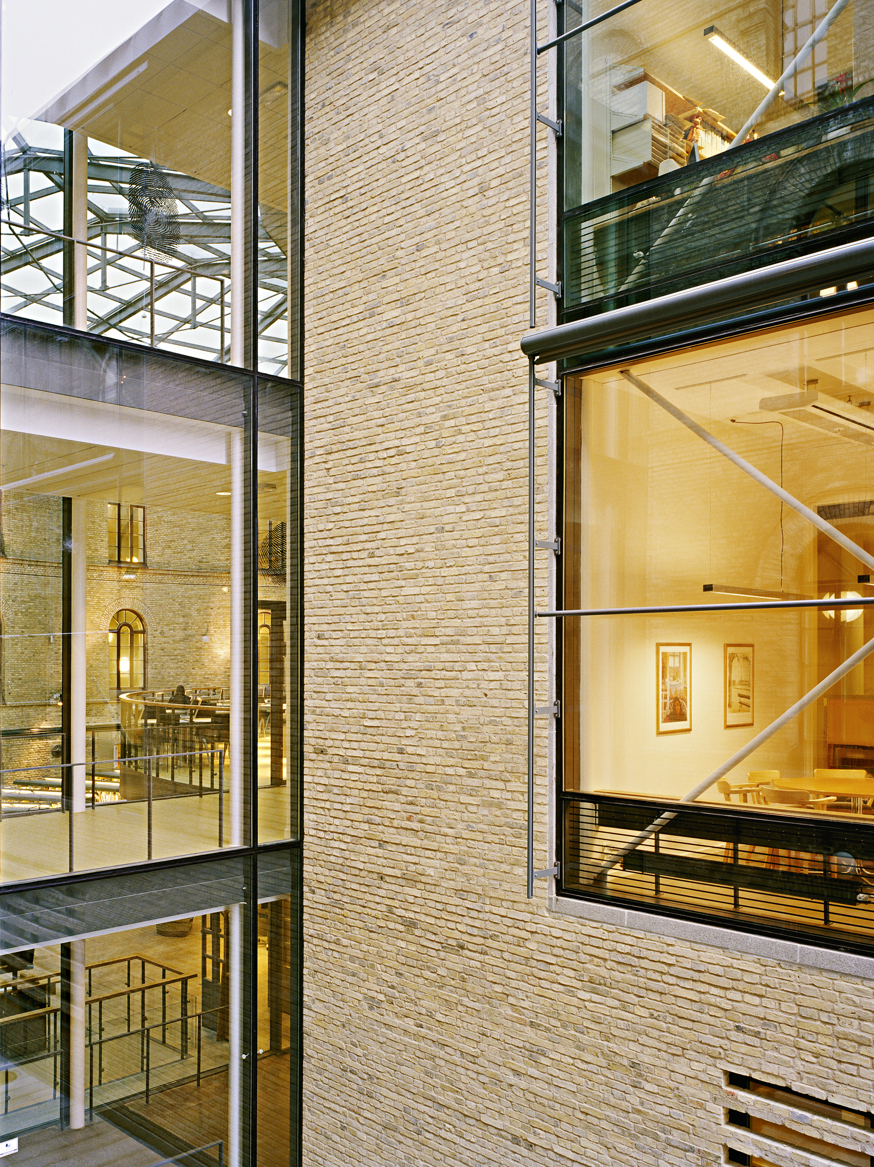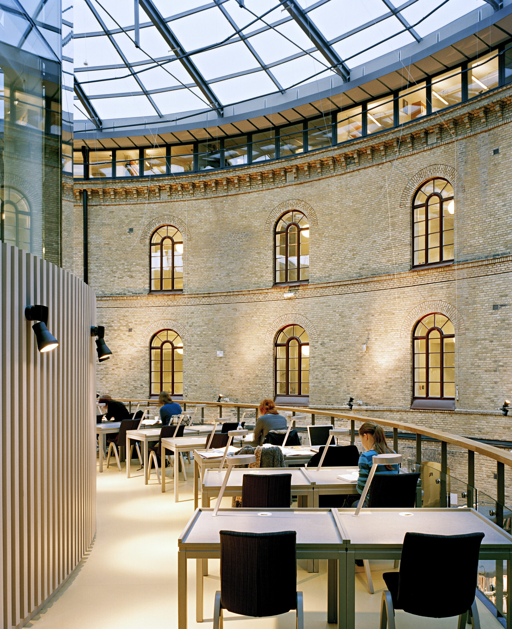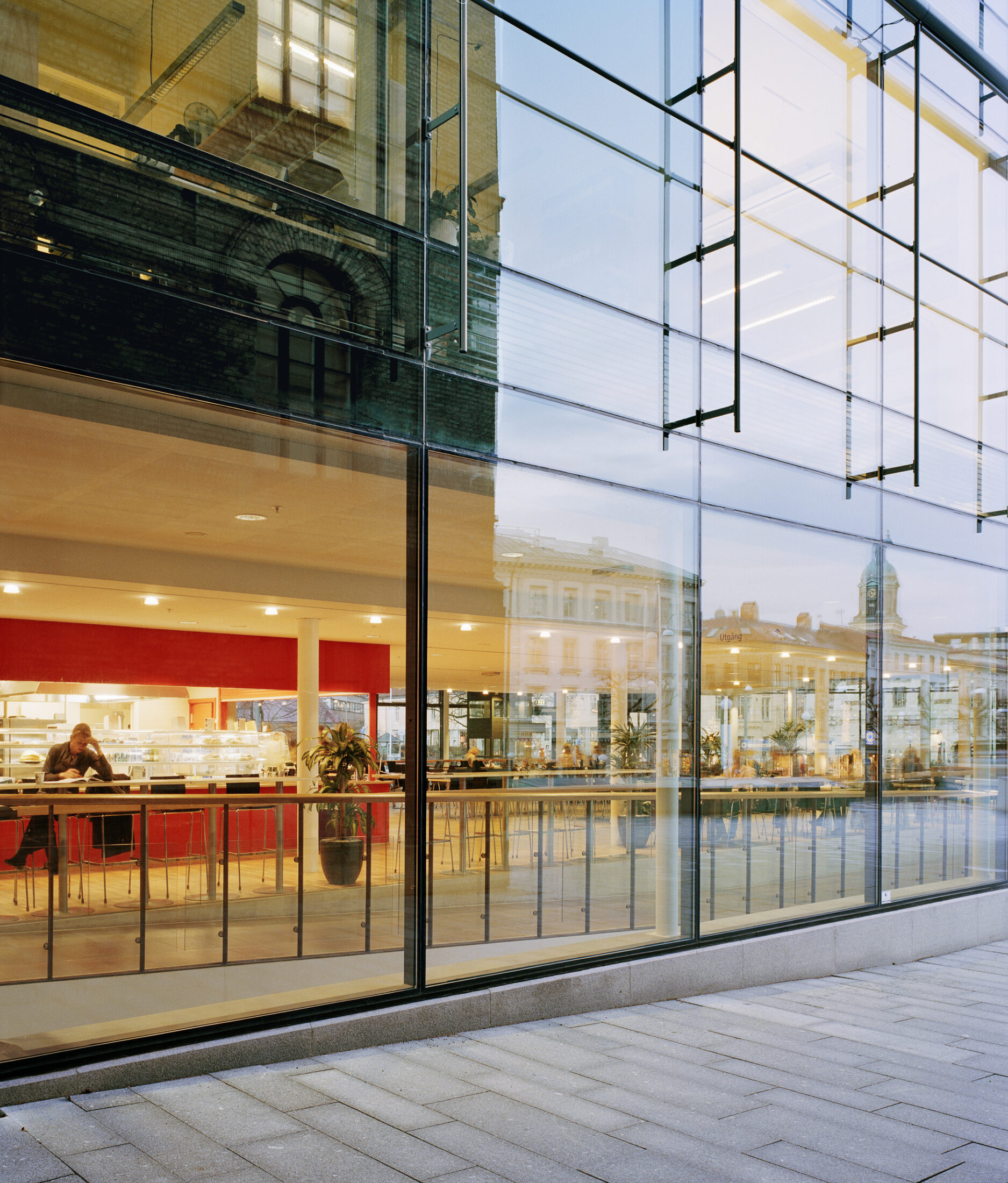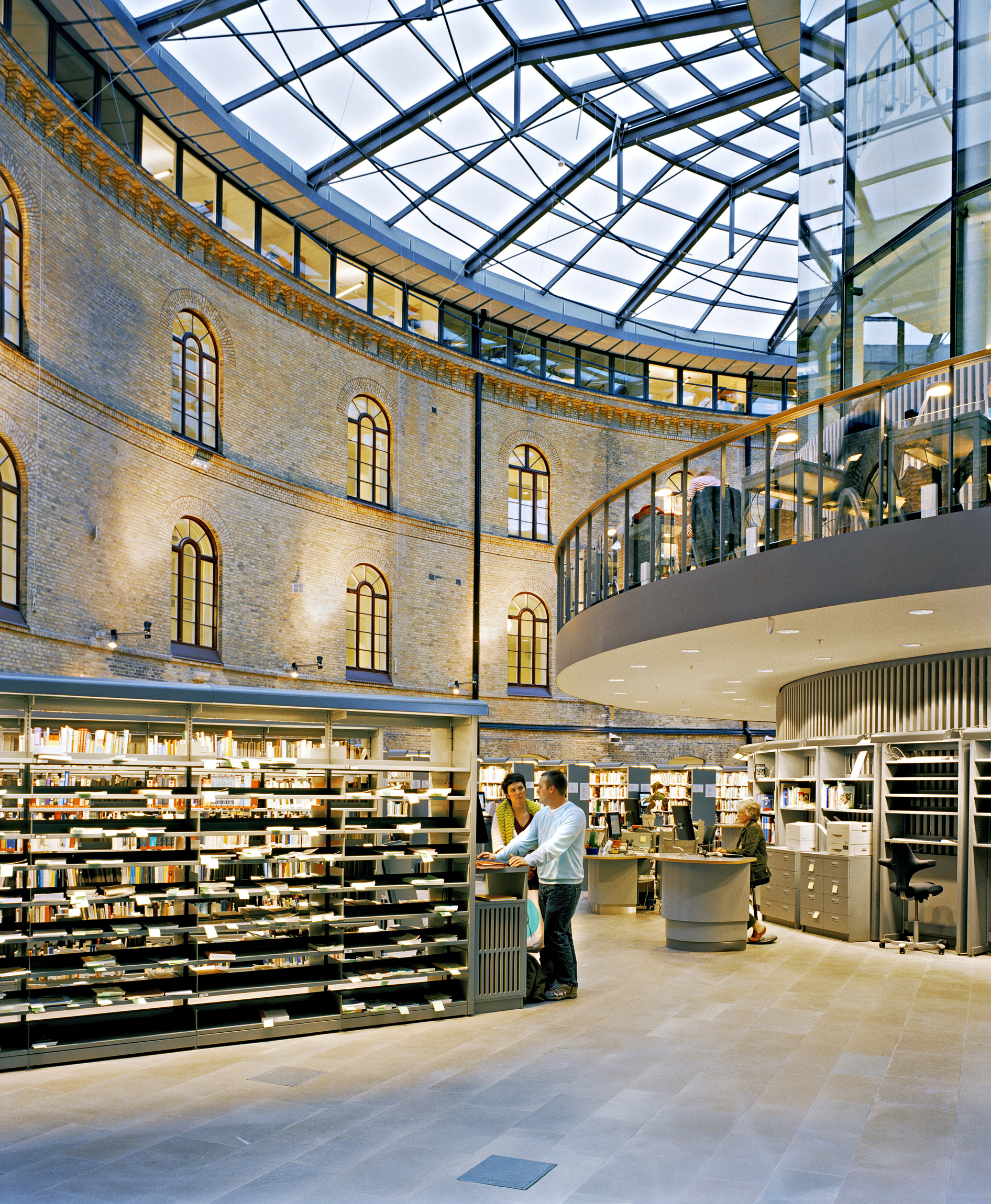Glasbyggnaden skjuter ut från sjukhusets gård och var i vårt bidrag menad att huvudsakligen innehålla bibliotek i två plan. Tanken var att biblioteket – kunskapens källa – skulle kliva ut i stadsrummet och annonsera verksamheten. Under den fortsatta processen önskade dock brukarna flytta biblioteket till bottenvåningen, varför den nya bibliotekshallen ligger i ett nytt stort överglasat rum mellan Sociala huset och tillbyggnaden. Tillbyggnaden har anpassats till ett nytt innehåll och rymmer, förutom huvudentré och café, även lärarnas arbetsrum.