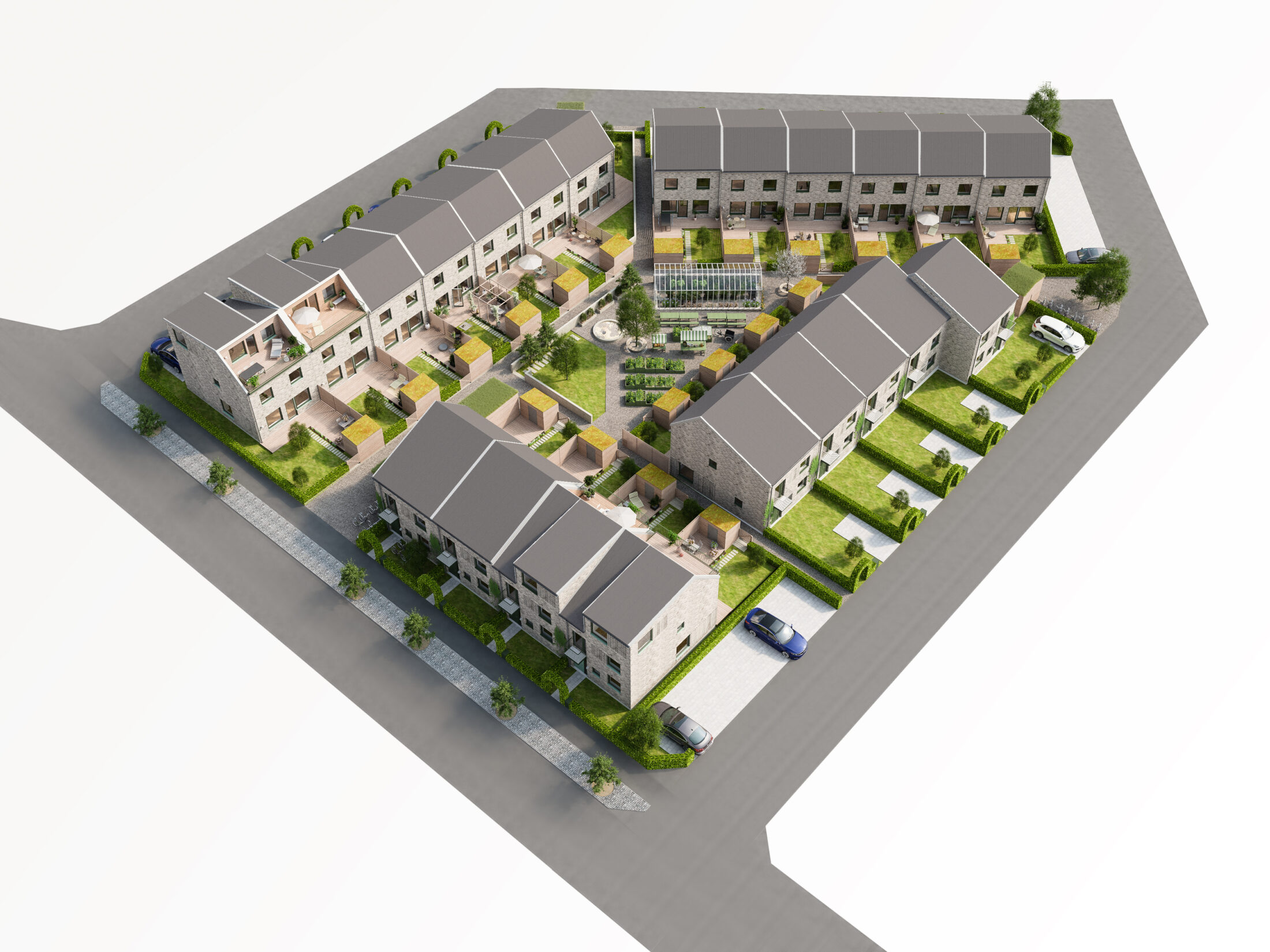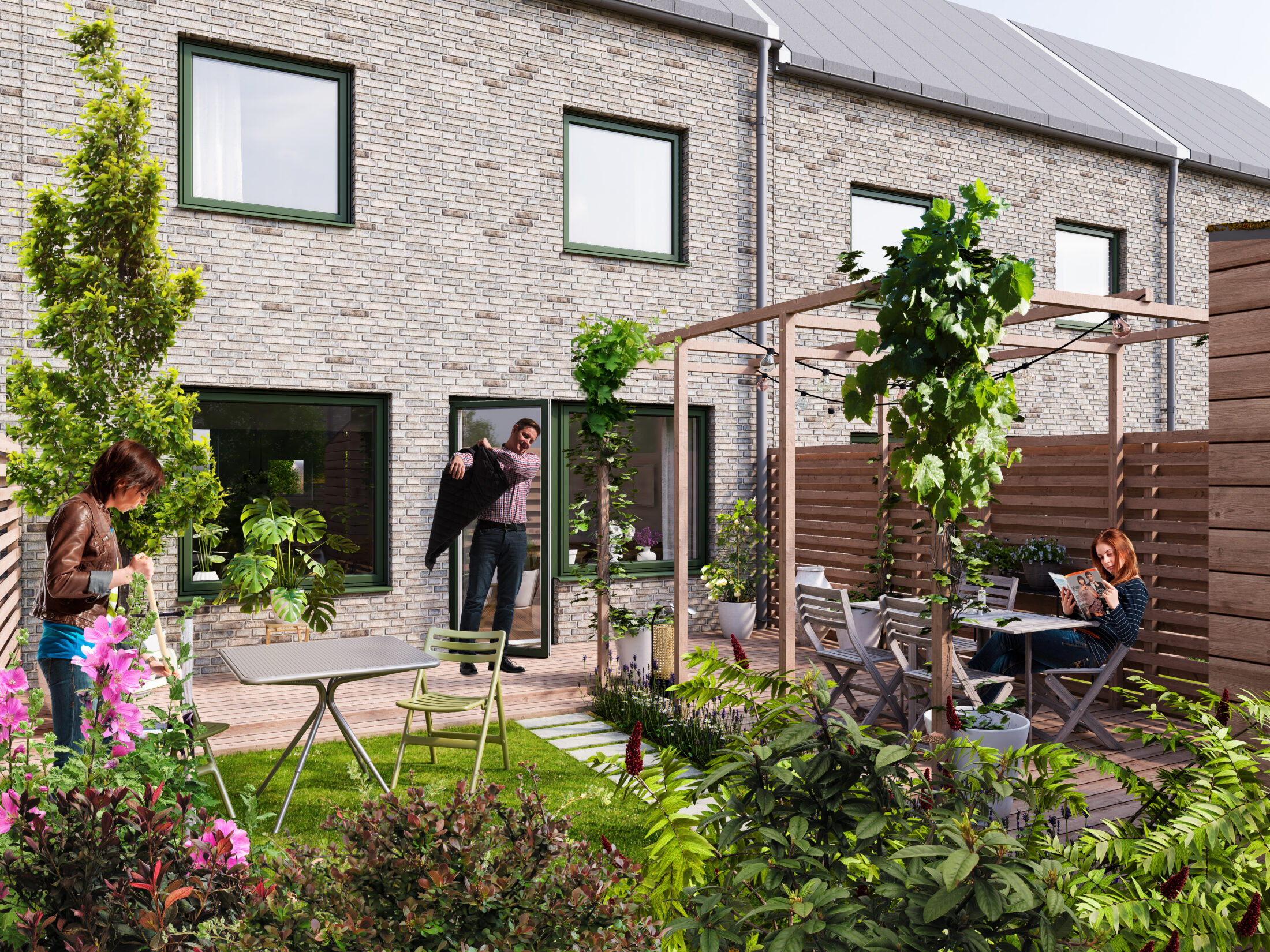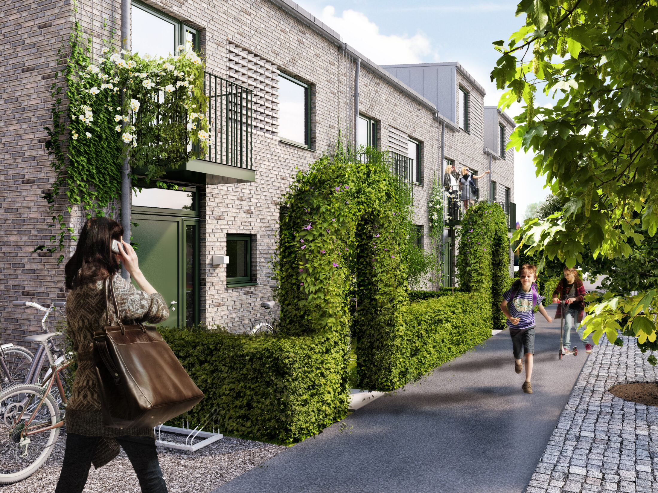 Vårt kvarter innehåller 22 radhus vilka ramar in en gemensam gård. Visionen för kvarteret är att skapa framtidens bostäder med plats för hållbart vardagsliv: odling i små privata trädgårdstäppor, fest och större odlingsprojekt i gemensamt växthus, vila och utsikt från takterrasserna – ut över det lilla gemensamma gårdsrummet, och ut över stadens siluett där också havets blänk kan anas i söder.