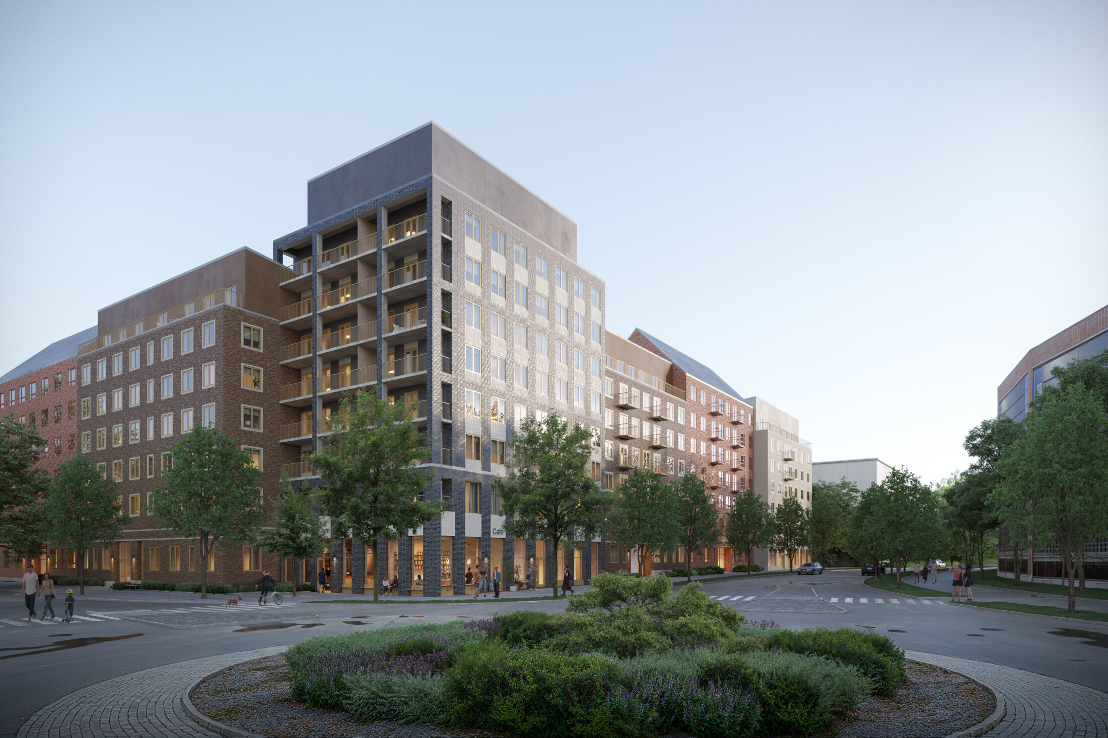 I kvarterets inre skapas en lugn och skyddad bostadsgård med oslagbara möjligheter till trygg lek, odling, samvaro, barnkalas, grillfest och gemenskap. Den tydliga gränsen mellan privat och offentligt skapar förutsättningar för urbana kvaliteter och aktiva bottenvåningar mot omgivande gator.
