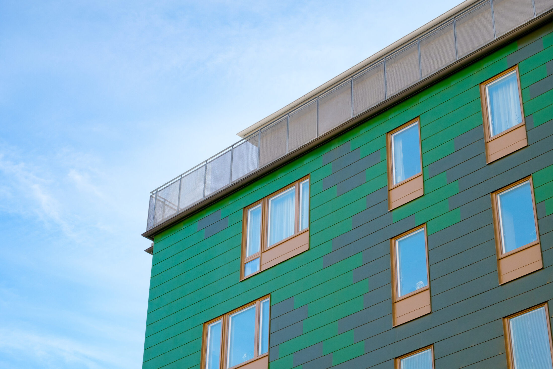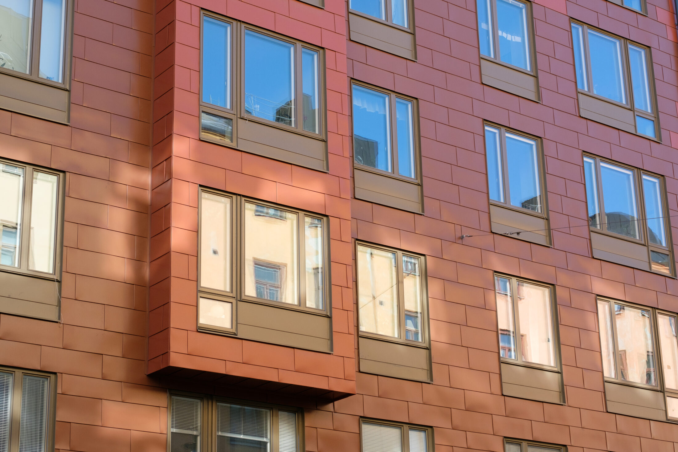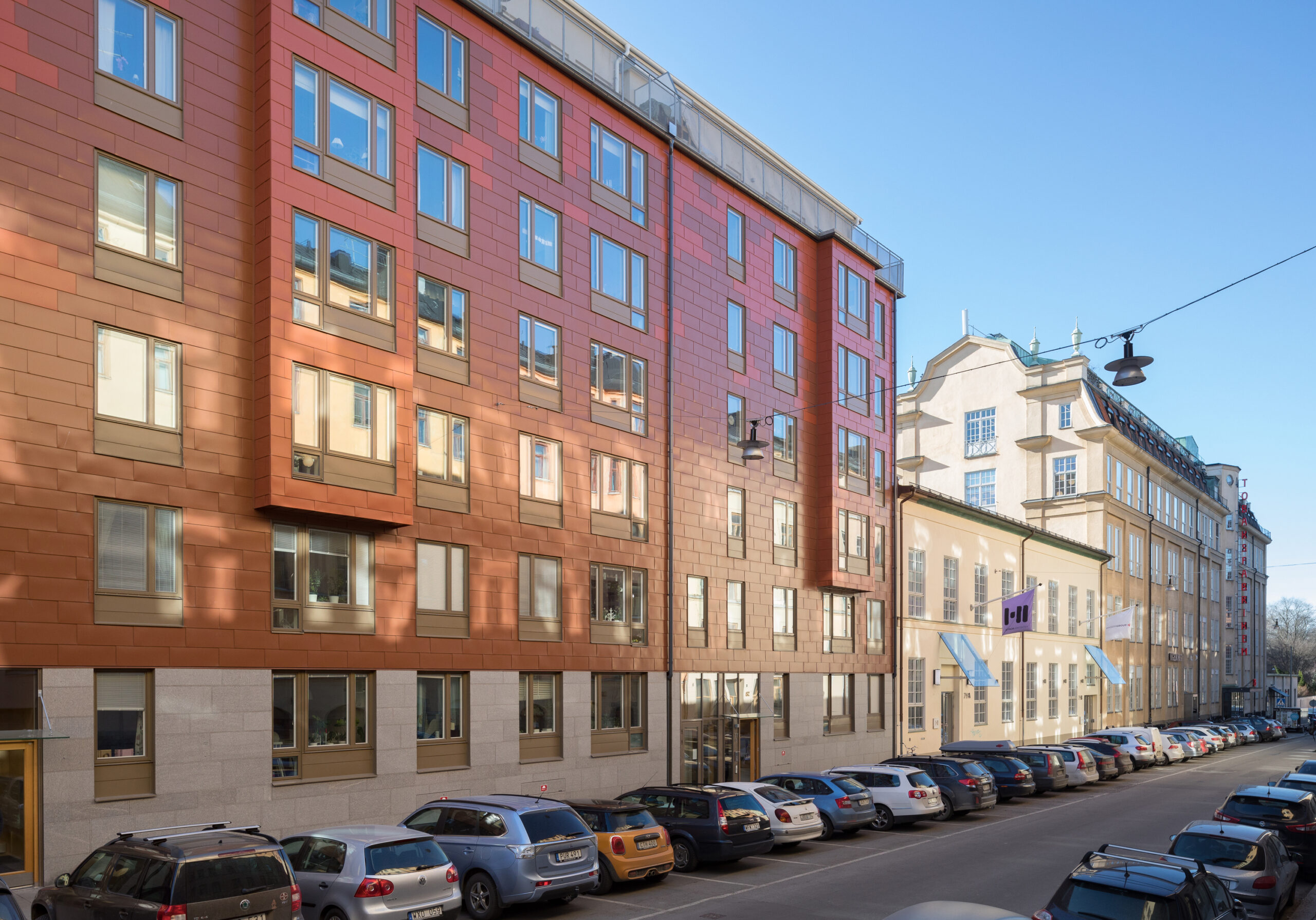 Bebyggelsen ville vi göra samtida med ett nytt material på fasaderna mot gatan. Vi valde en industriell karaktär med blanka plåtskivor i skiftande kulörer för de fem bostadsvåningarna.