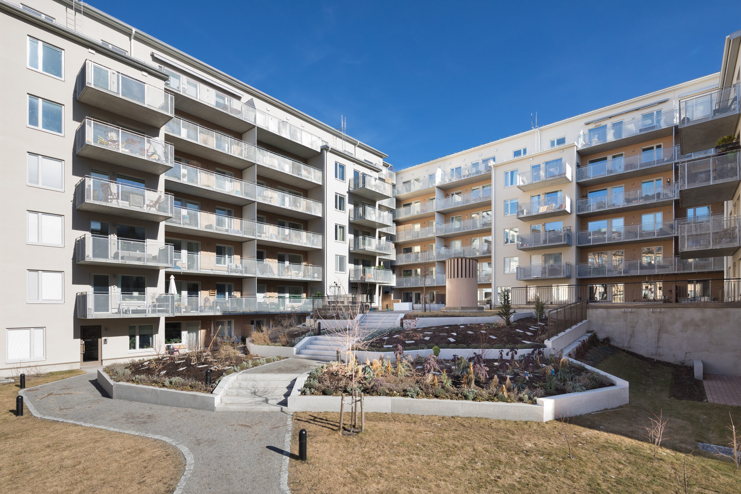De allra flesta lägenheter är genomgående och har ett öppet samband mellan vardagsrum och kök. Köken placerade mot gatan är rymliga och har ett fönsterparti med ett franskt fönster som för in ljuset ännu längre in i lägenheten. Vardagsrummen med sin generösa balkong vetter mot gården som ligger i ett söder- och västläge. Både balkonger och de stora terrasserna högst upp ger möjlighet till både odling och samvaro. Hörnlägenheterna får en fin rymd och unik utsikt i och med det öppna sambandet mellan kök och vardagsrum.