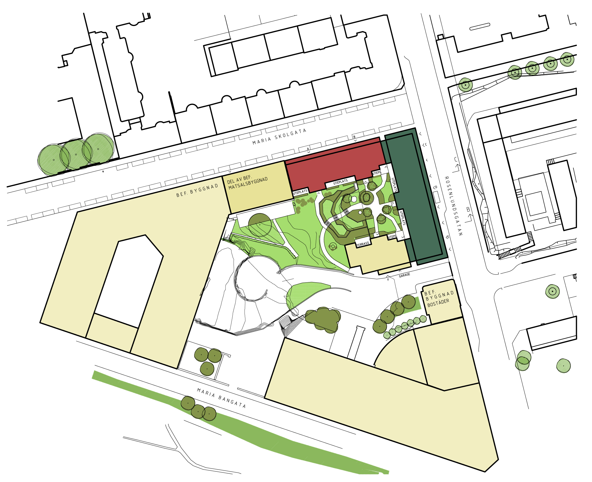 Utanför det befintliga Tobaksmonopolets matsalsbyggnad finns en park som historiskt utnyttjats av fabrikspersonalen under raster. Den är viktig att bevara ur ett kulturhistoriskt perspektiv. Där finns också en del exotiskt växtmaterial att bevara. Den nya bostadsgården ansluter till den befintliga topografin och trappar sig ner mot den kvarvarande befintliga delen av trädgården.